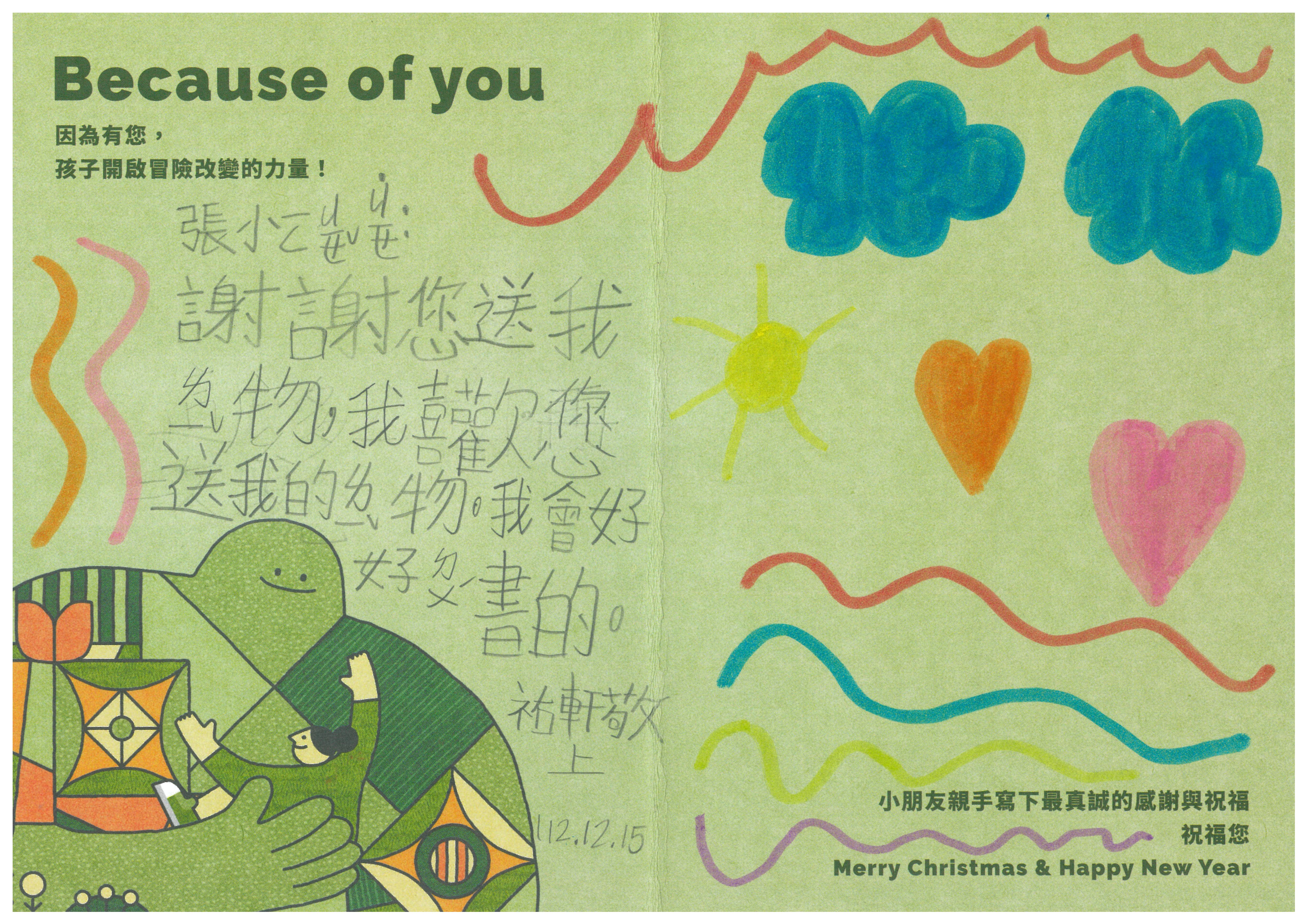 張小櫻 您好:方便您紀念與記錄,我們將孩子給您的感謝卡片掃描成圖檔。我們於2023/12/9(六)已將禮物發送到孩子的手上嚕!