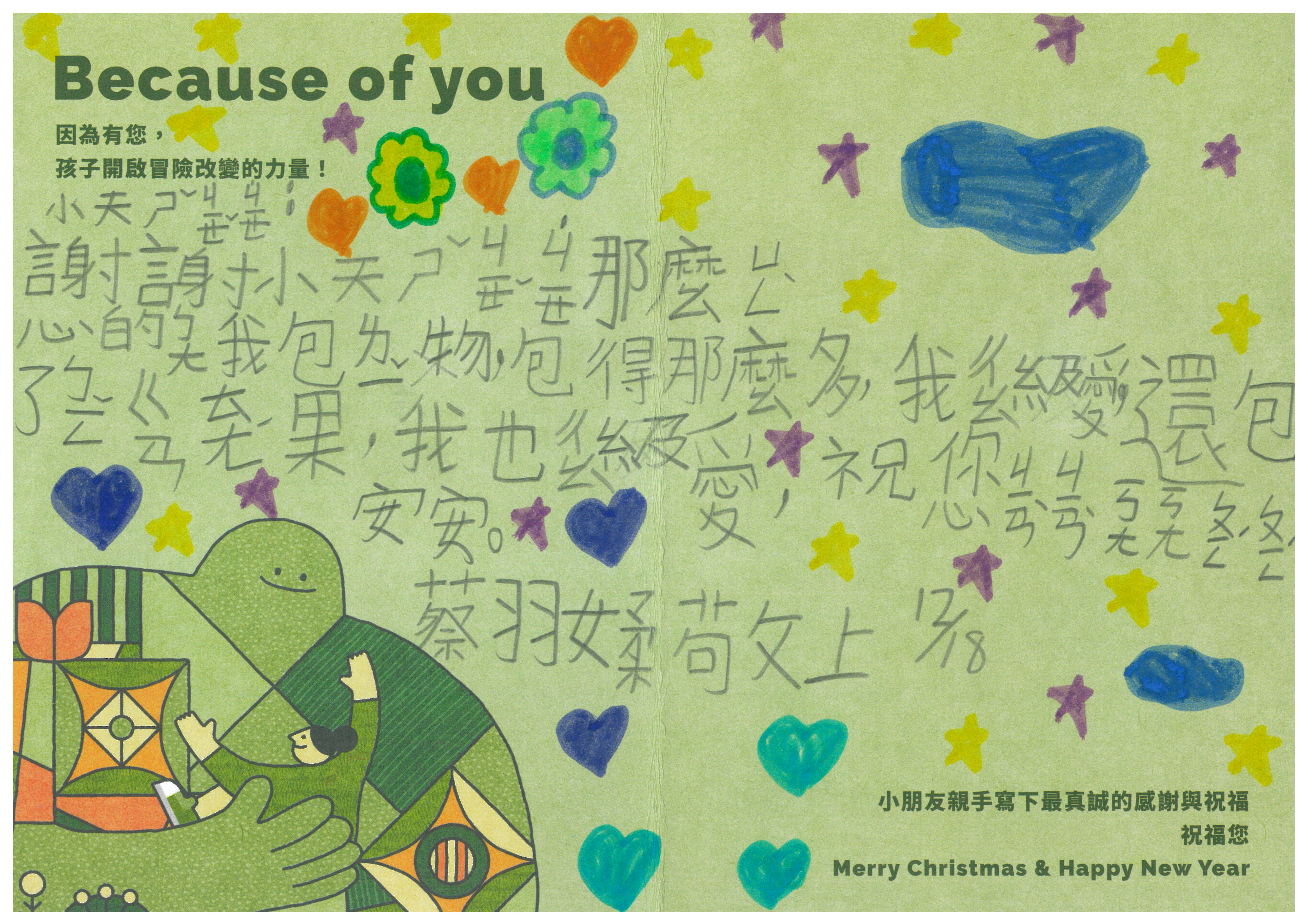 每份聖誕禮物內容:小朋友許下的心願禮物+親手寫下的鼓勵祝福卡片1張