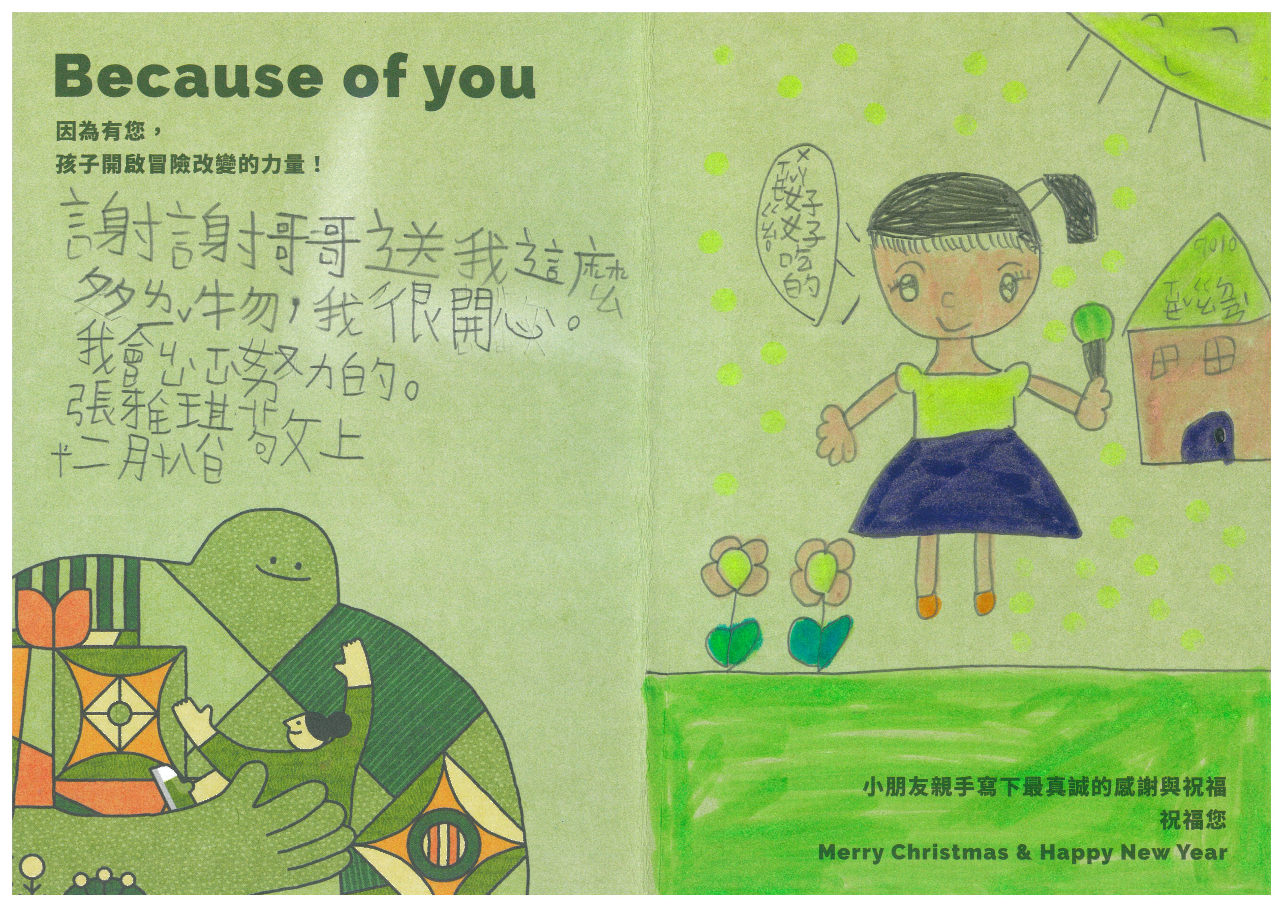 oscar 您好:方便您紀念與記錄,我們將孩子給您的感謝卡片掃描成圖檔。我們於2023/12/9(六)已將禮物發送到孩子的手上嚕!