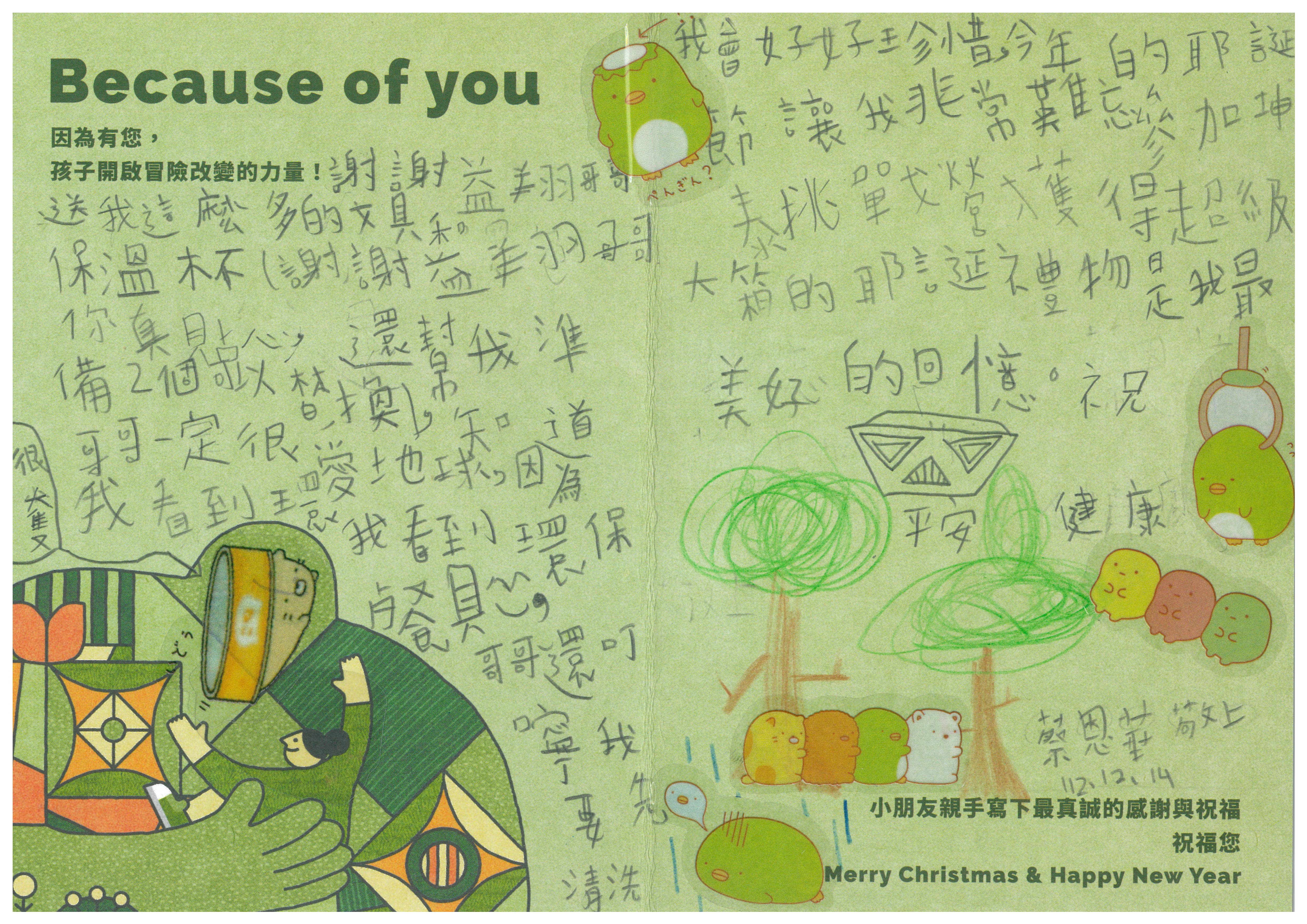 每份聖誕禮物內容:小朋友許下的心願禮物+親手寫下的鼓勵祝福卡片1張