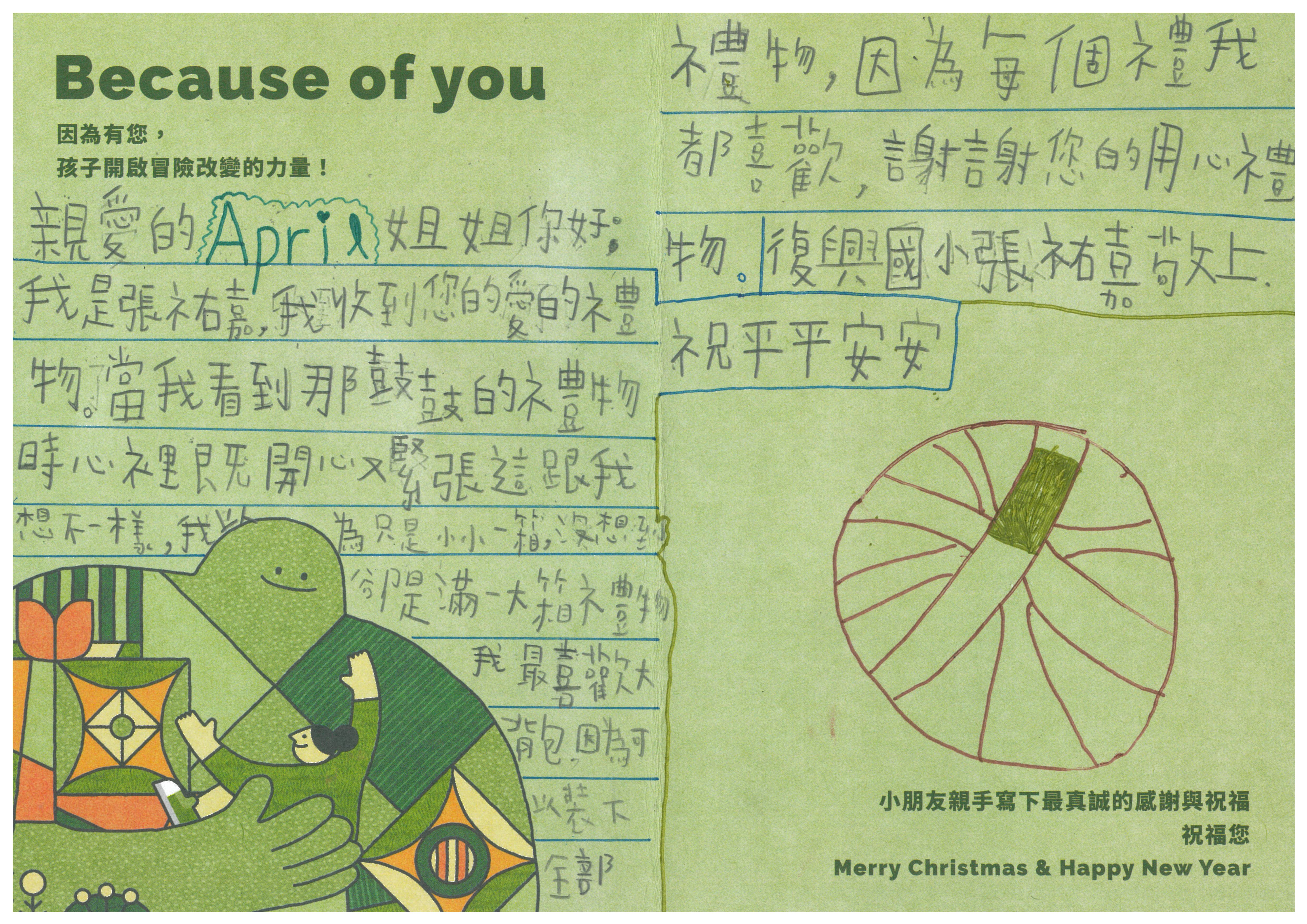 Aprilrun 您好:方便您紀念與記錄,我們將孩子給您的感謝卡片掃描成圖檔。我們於2023/12/9(六)已將禮物發送到孩子的手上嚕!