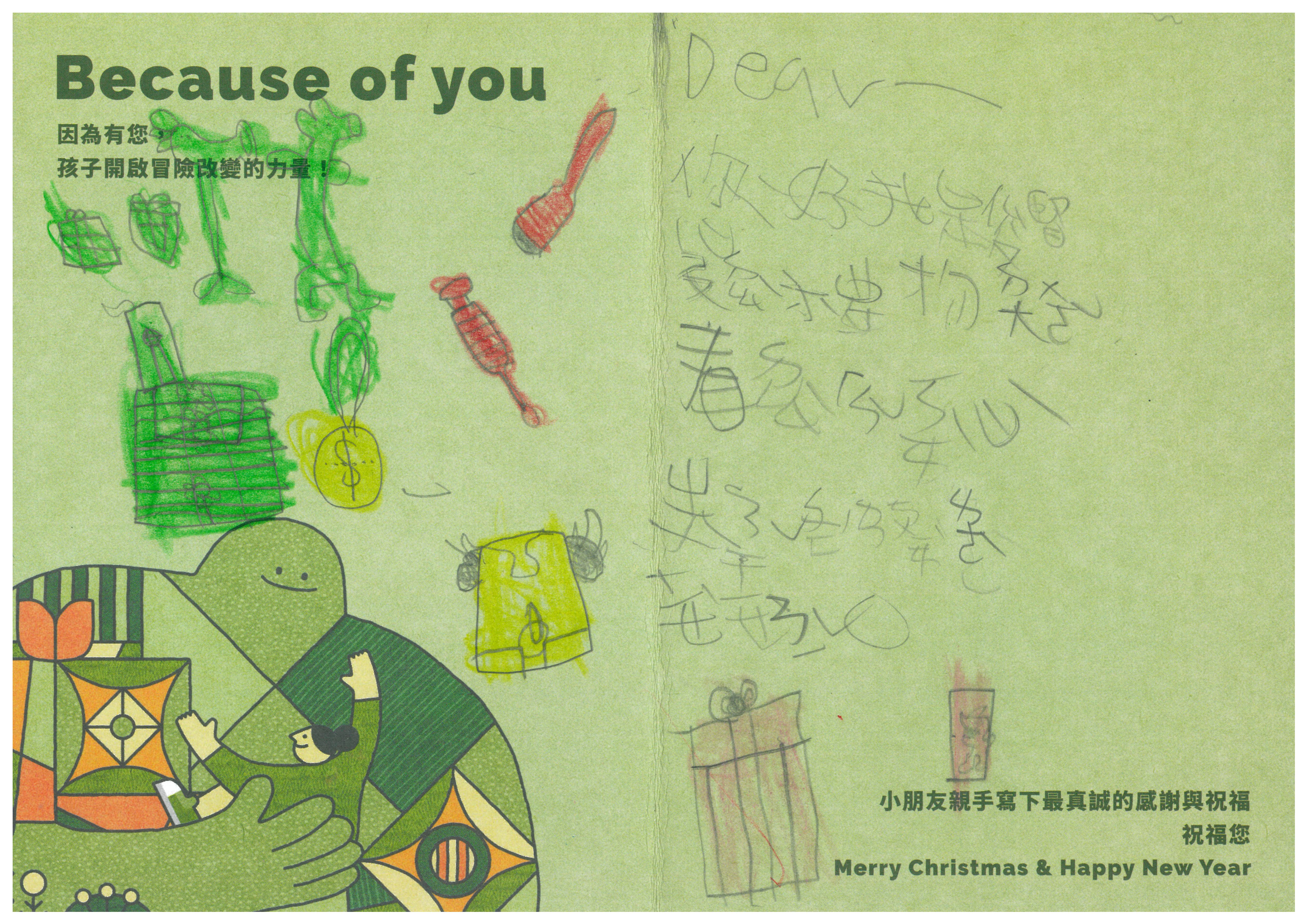 你好我是唐萱 您好:方便您紀念與記錄,我們將孩子給您的感謝卡片掃描成圖檔。我們於2023/12/9(六)已將禮物發送到孩子的手上嚕!