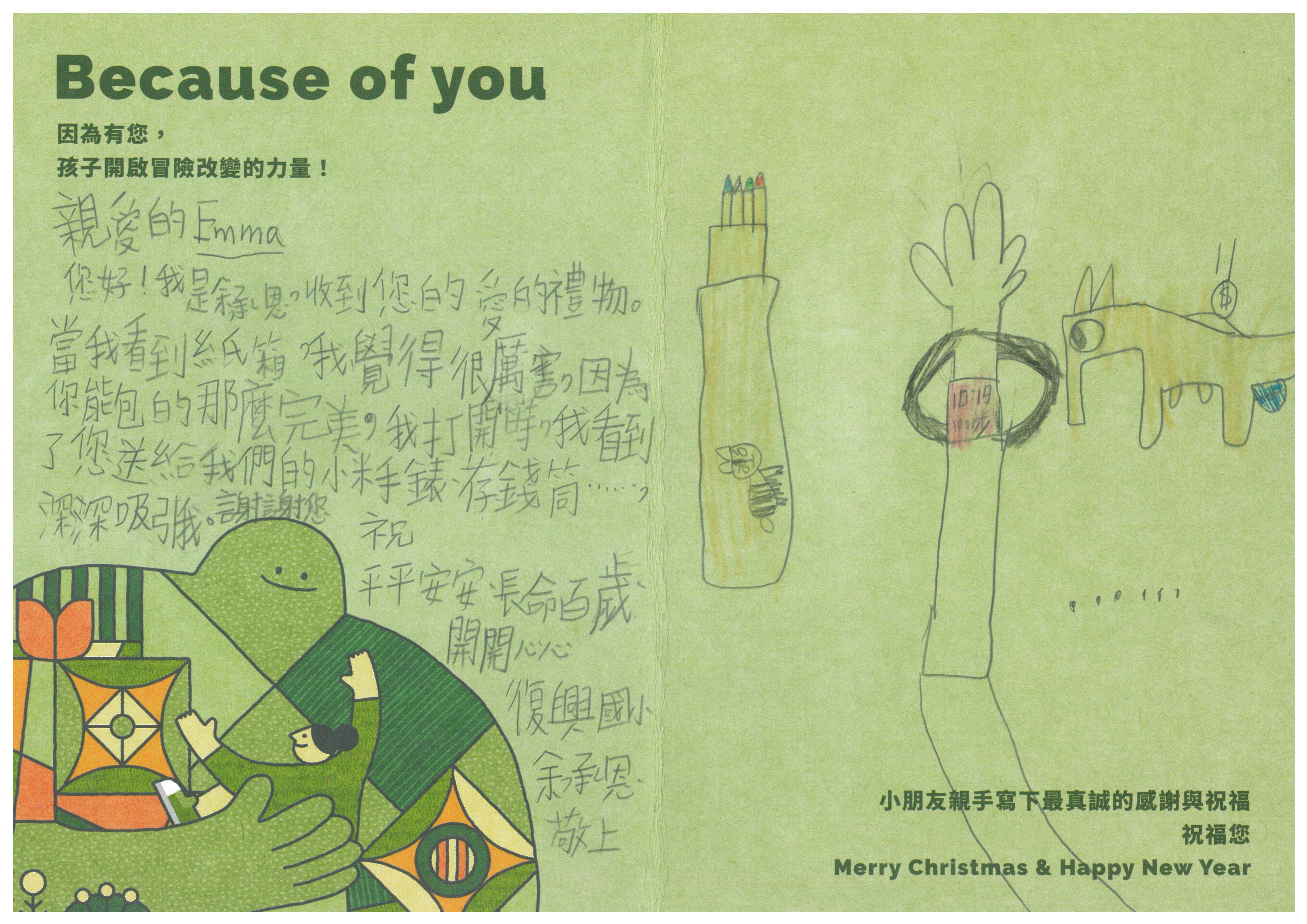 每份聖誕禮物內容:小朋友許下的心願禮物+親手寫下的鼓勵祝福卡片1張