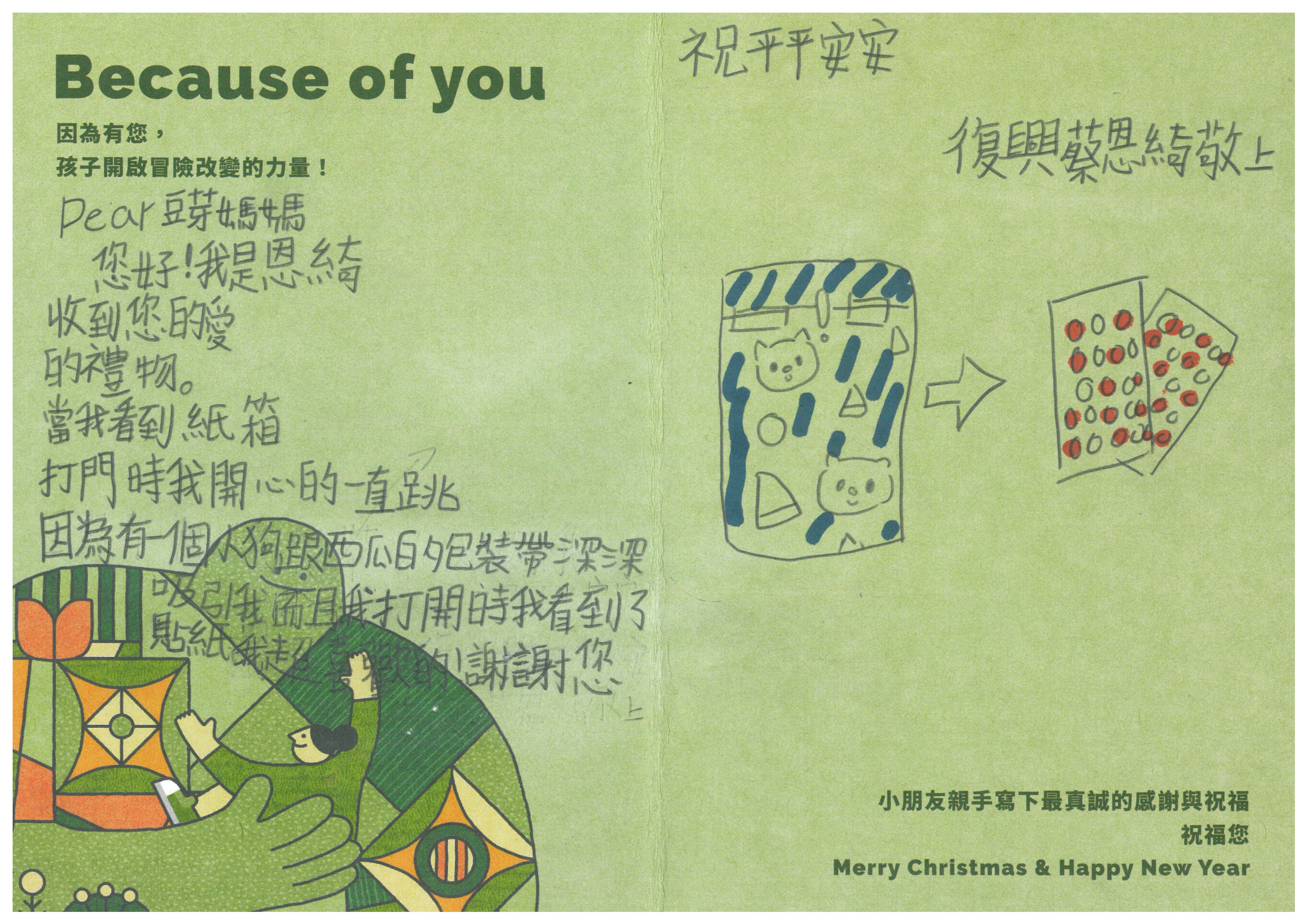 每份聖誕禮物內容:小朋友許下的心願禮物+親手寫下的鼓勵祝福卡片1張