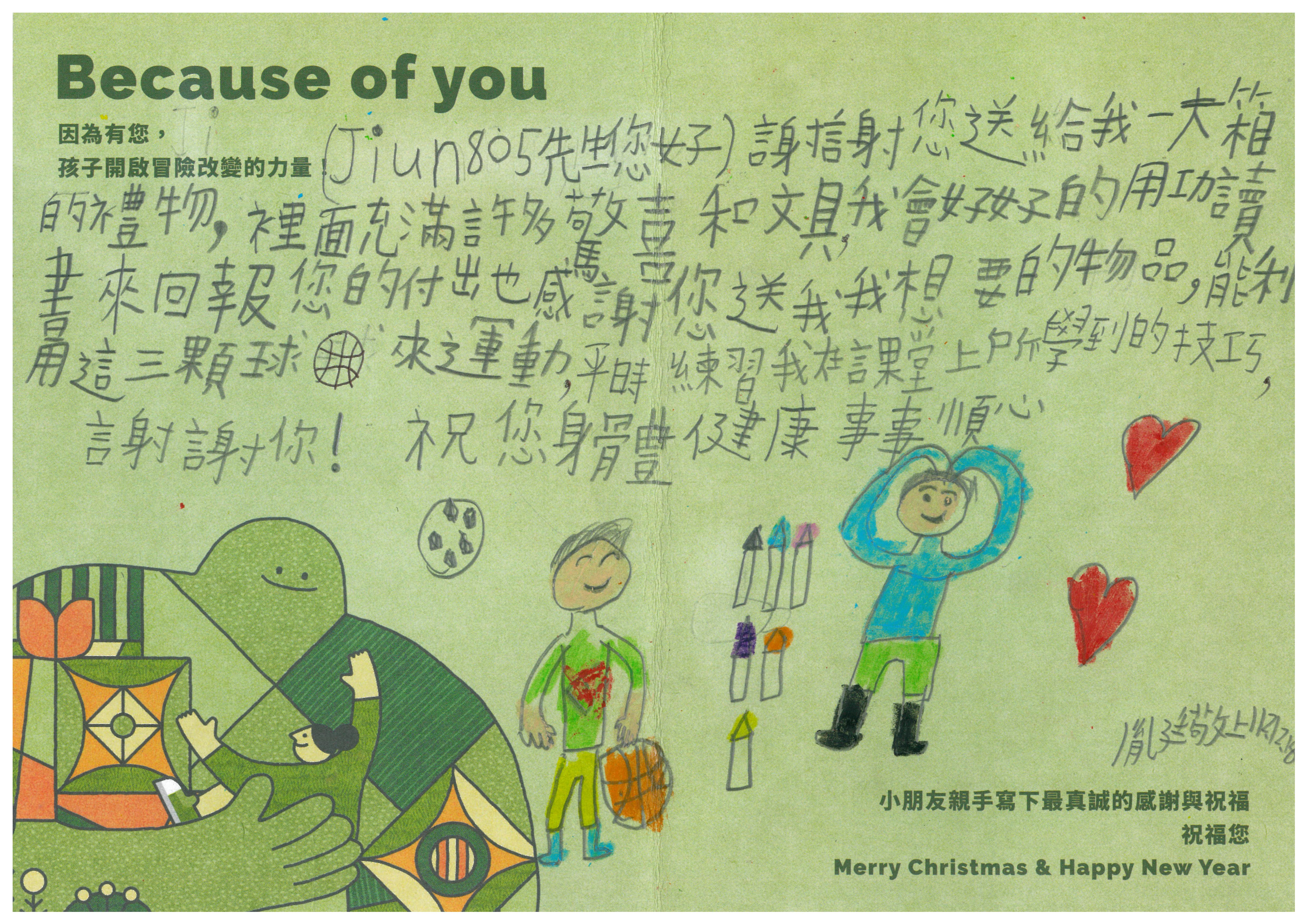 每份聖誕禮物內容:小朋友許下的心願禮物+親手寫下的鼓勵祝福卡片1張