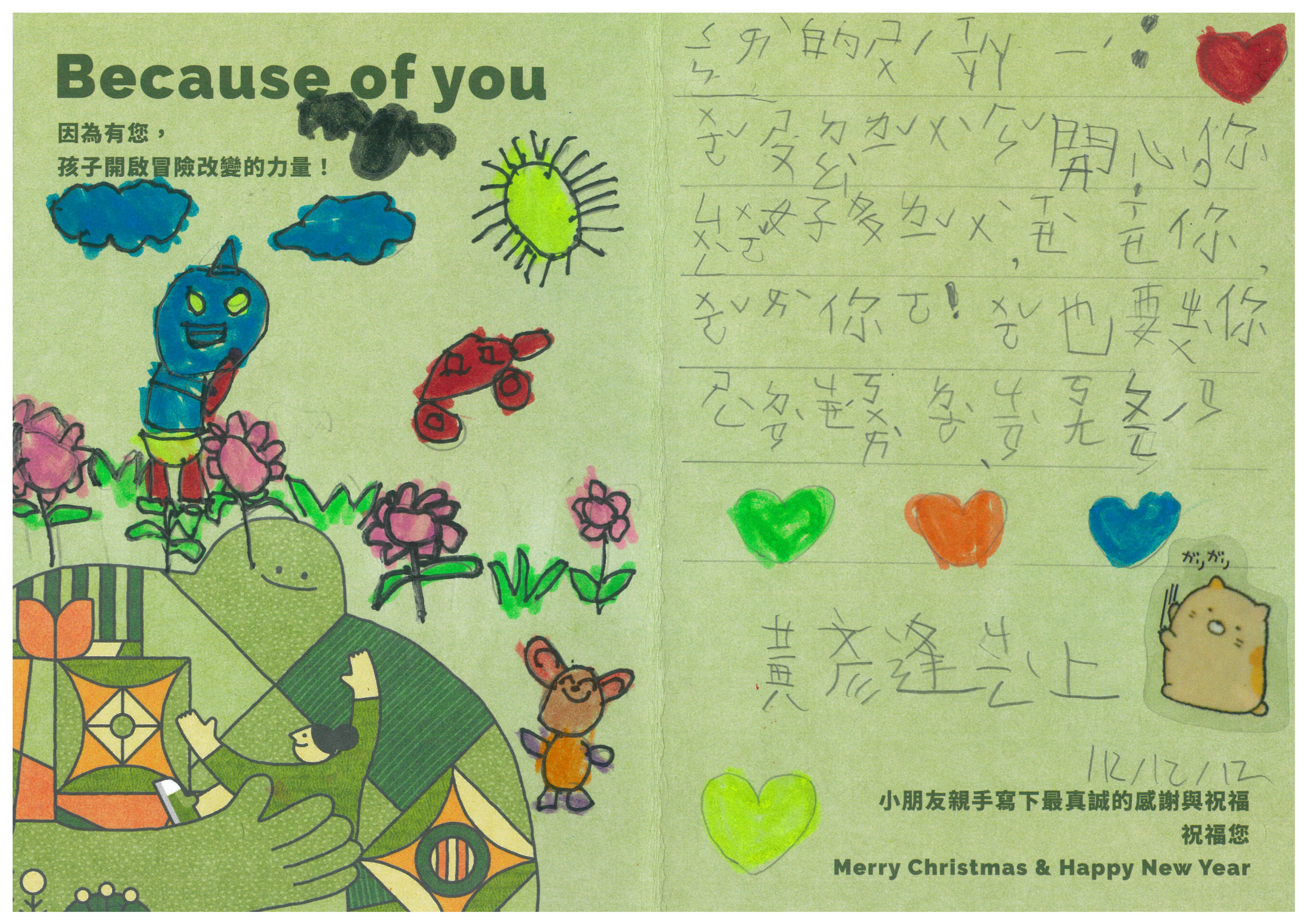 每份聖誕禮物內容:小朋友許下的心願禮物+親手寫下的鼓勵祝福卡片1張