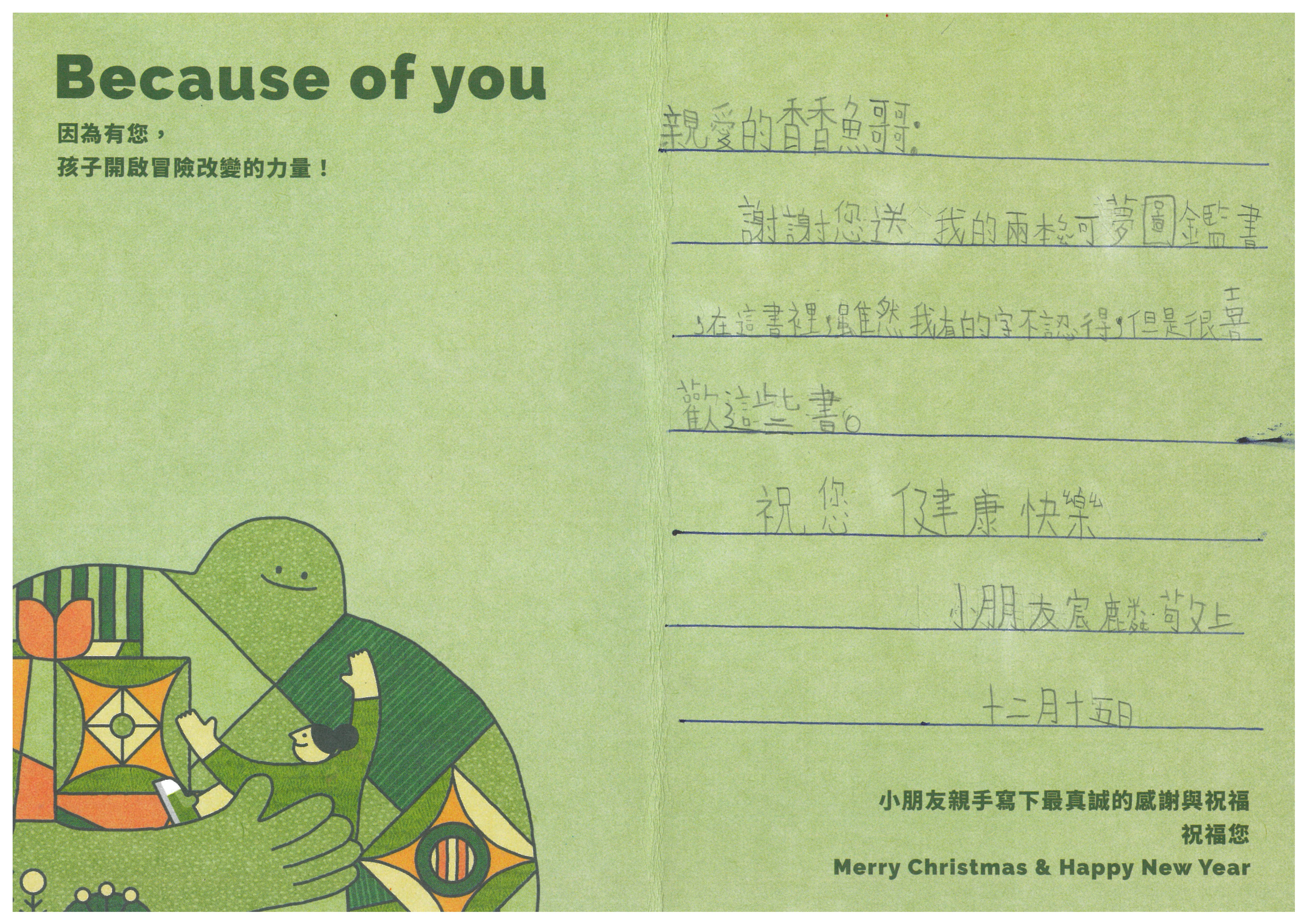 香香魚 您好:方便您紀念與記錄,我們將孩子給您的感謝卡片掃描成圖檔。我們於2023/12/9(六)已將禮物發送到孩子的手上嚕!