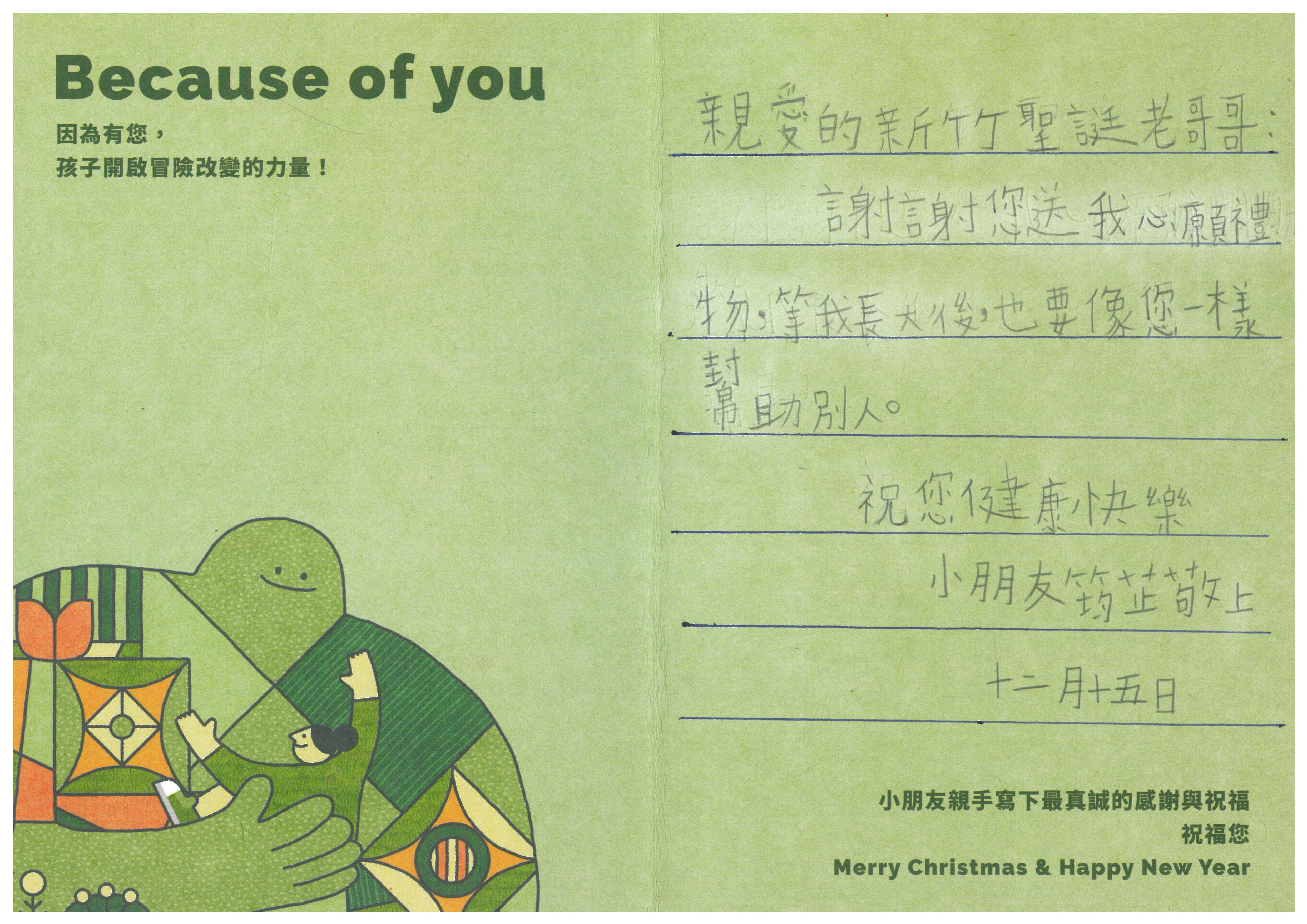 每份聖誕禮物內容:小朋友許下的心願禮物+親手寫下的鼓勵祝福卡片1張