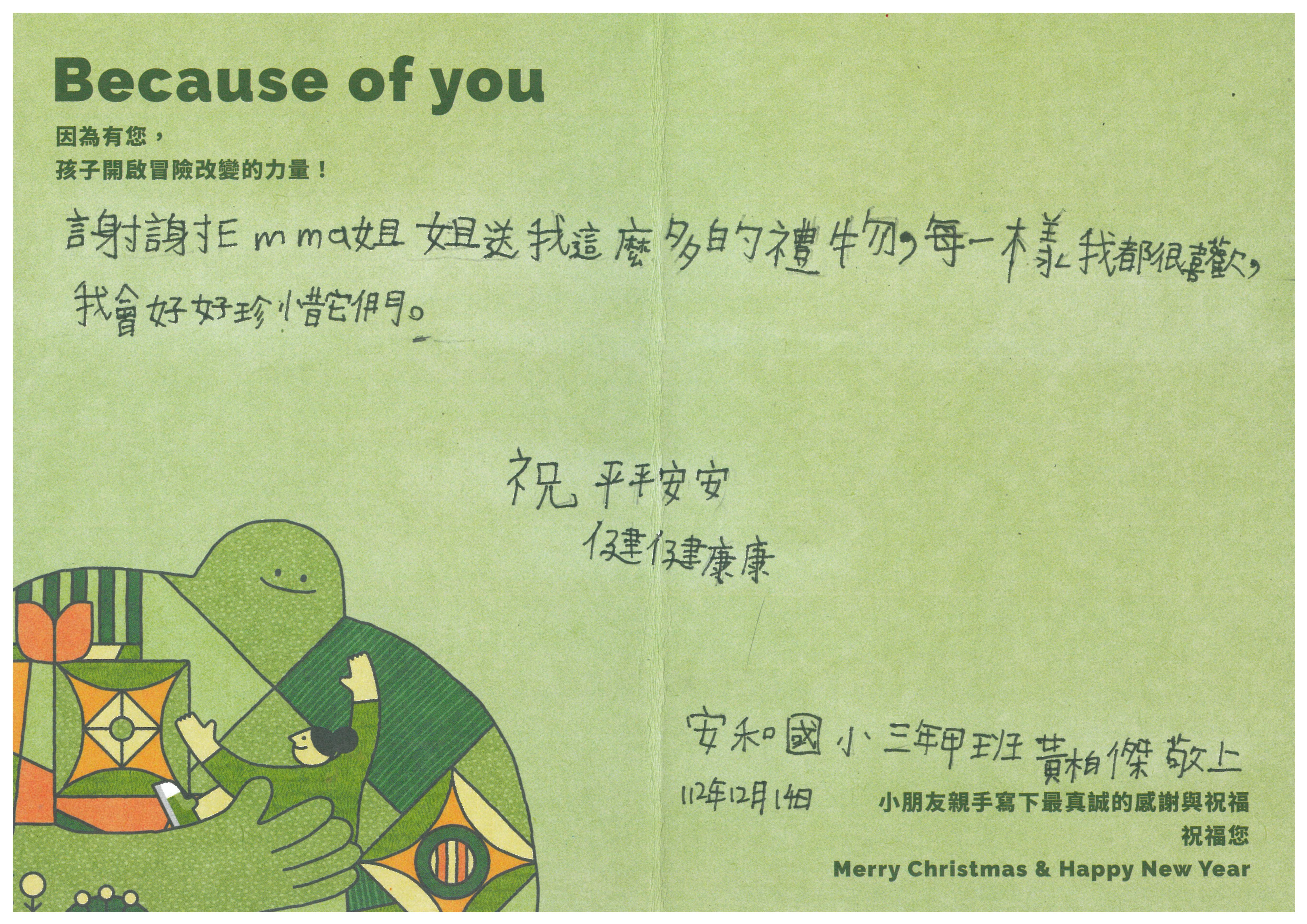 每份聖誕禮物內容:小朋友許下的心願禮物+親手寫下的鼓勵祝福卡片1張