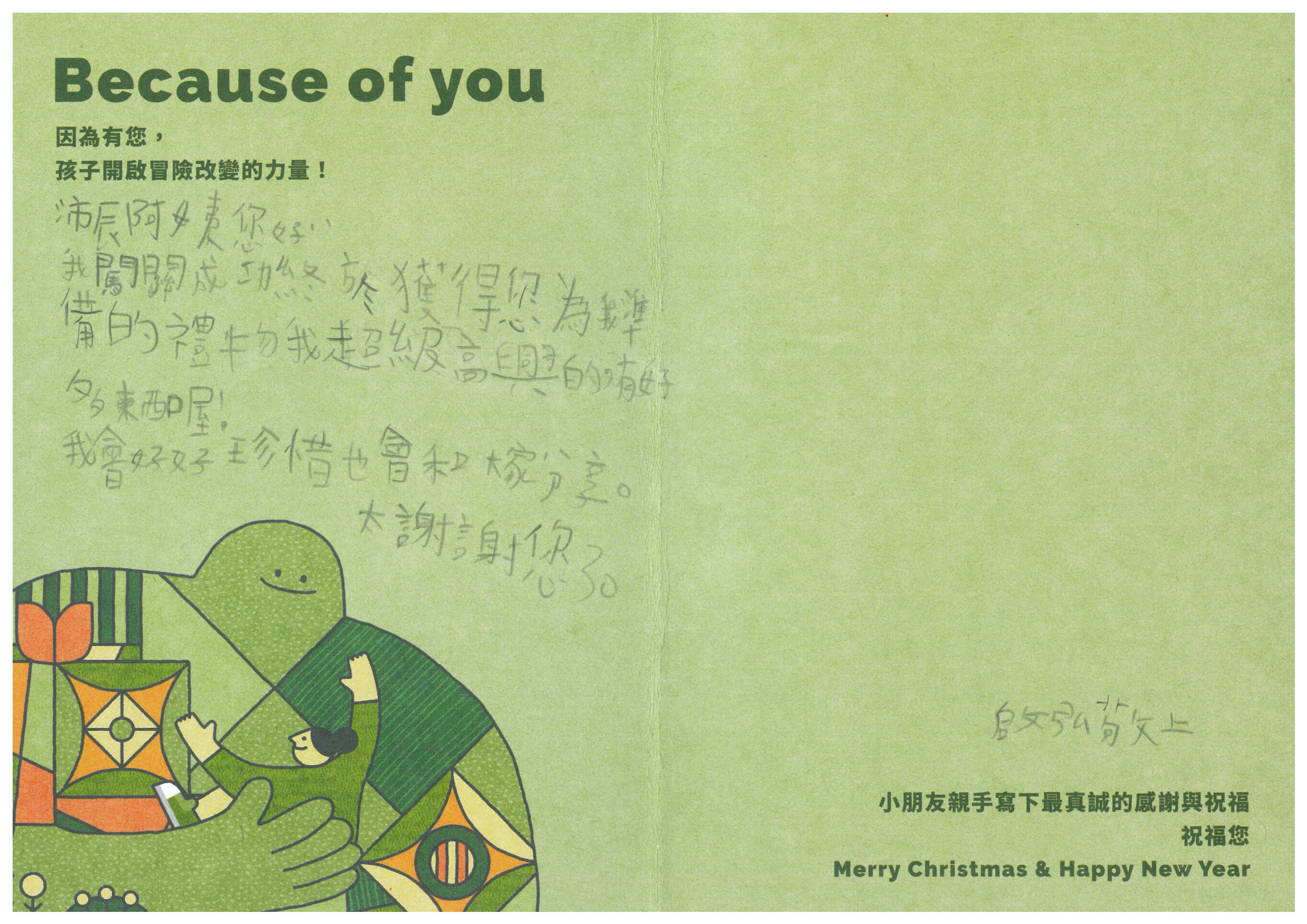 每份聖誕禮物內容:小朋友許下的心願禮物+親手寫下的鼓勵祝福卡片1張