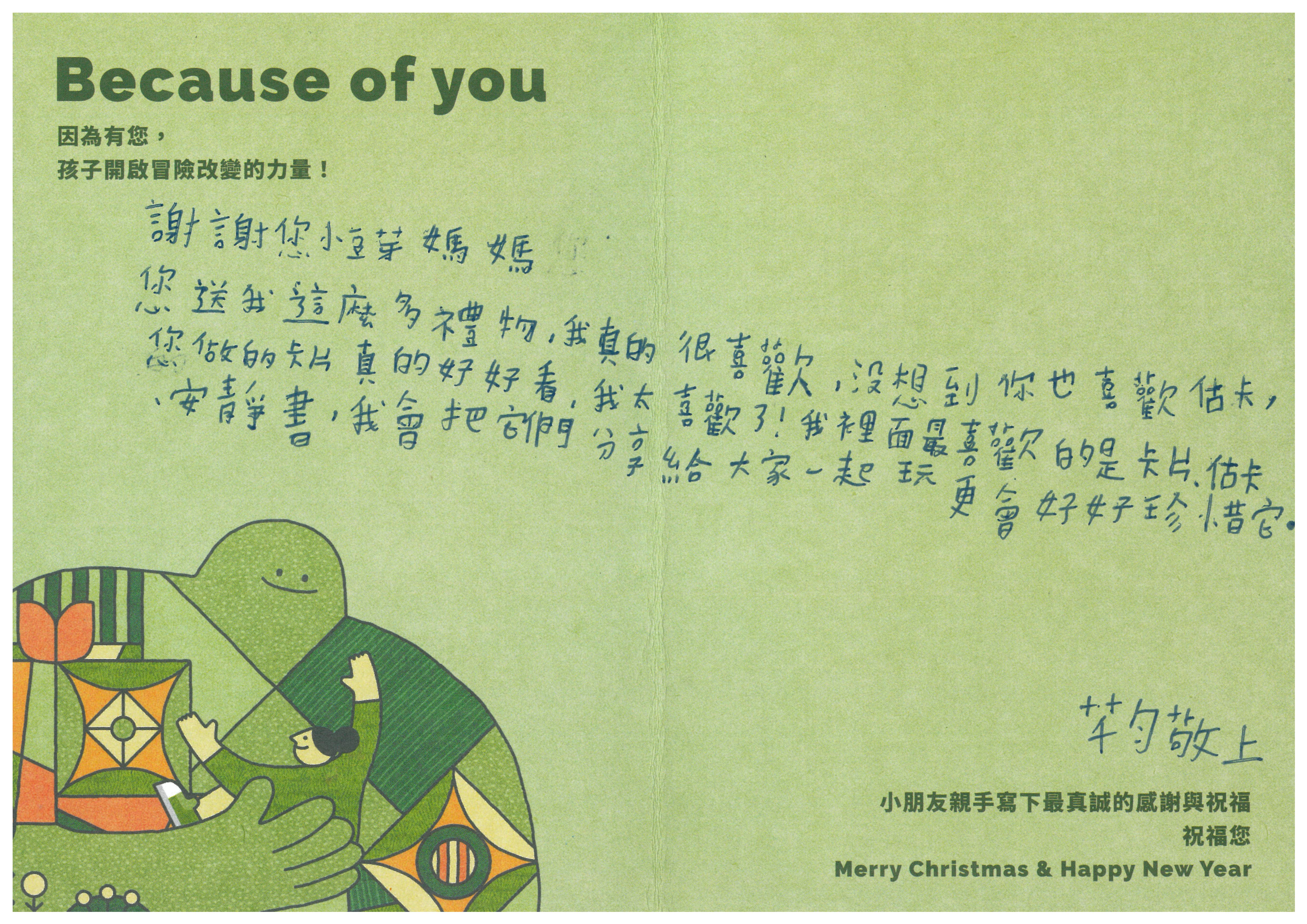 每份聖誕禮物內容:小朋友許下的心願禮物+親手寫下的鼓勵祝福卡片1張