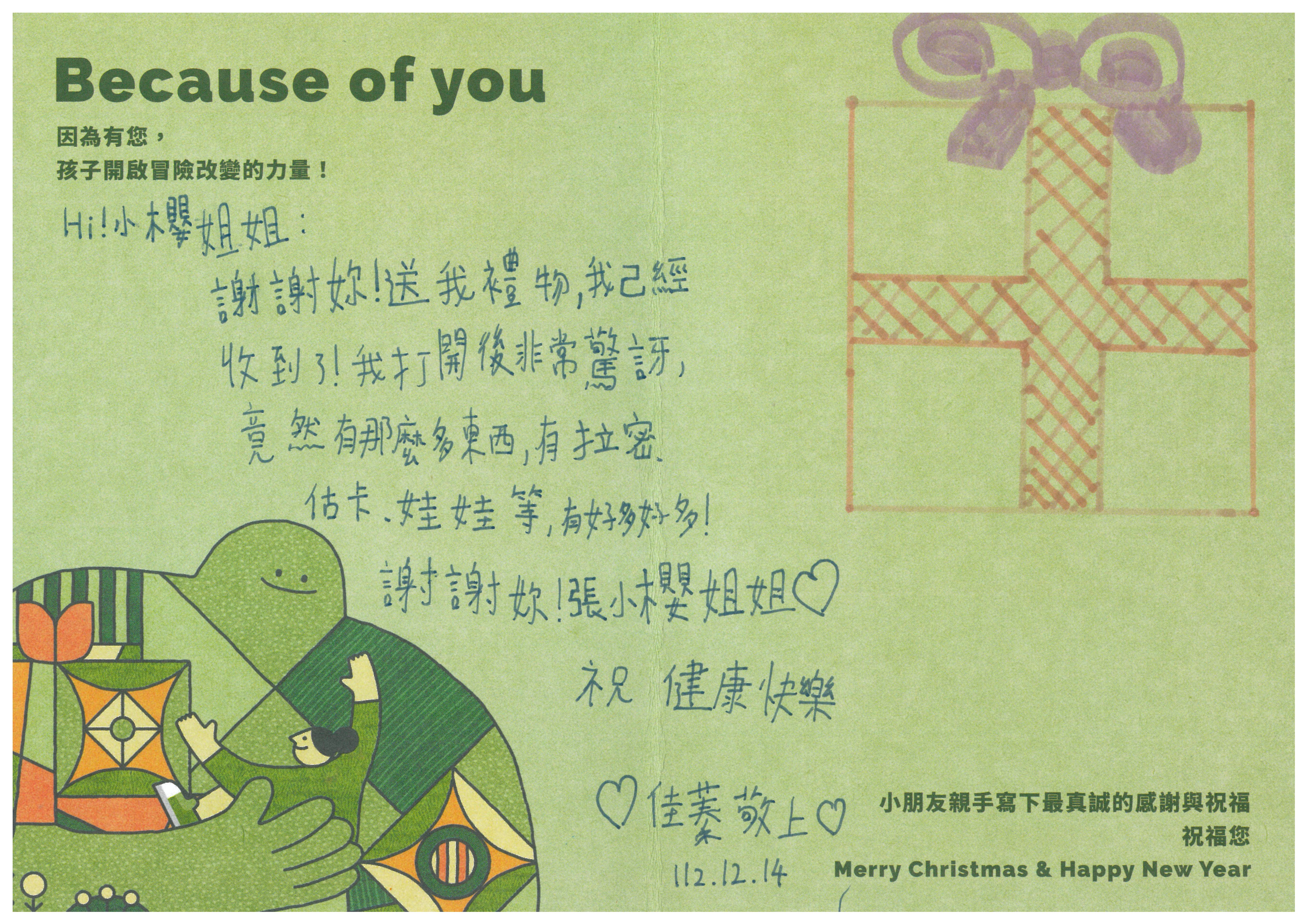 每份聖誕禮物內容:小朋友許下的心願禮物+親手寫下的鼓勵祝福卡片1張
