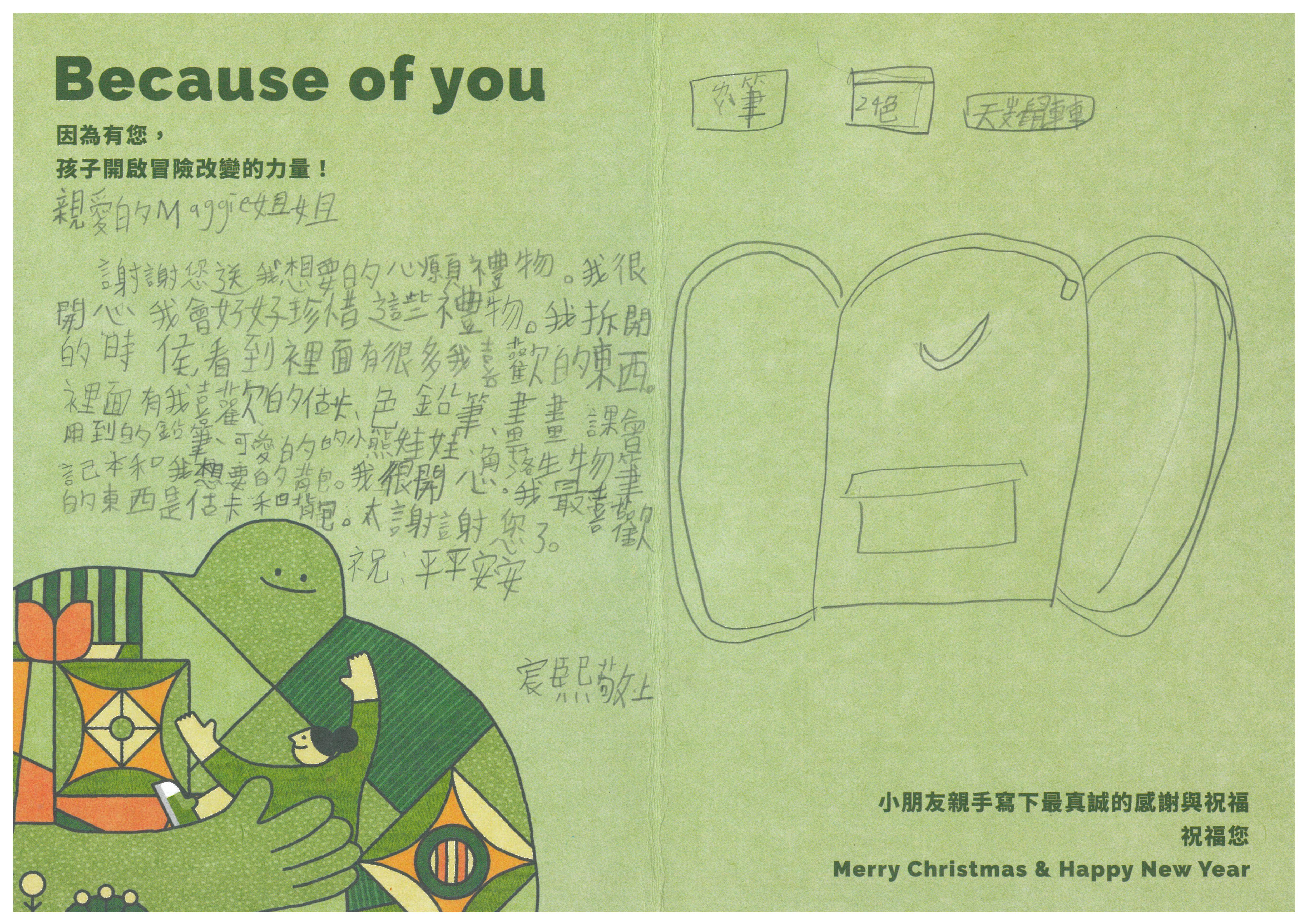 Maggiecsh 您好:方便您紀念與記錄,我們將孩子給您的感謝卡片掃描成圖檔。我們於2023/12/9(六)已將禮物發送到孩子的手上嚕!