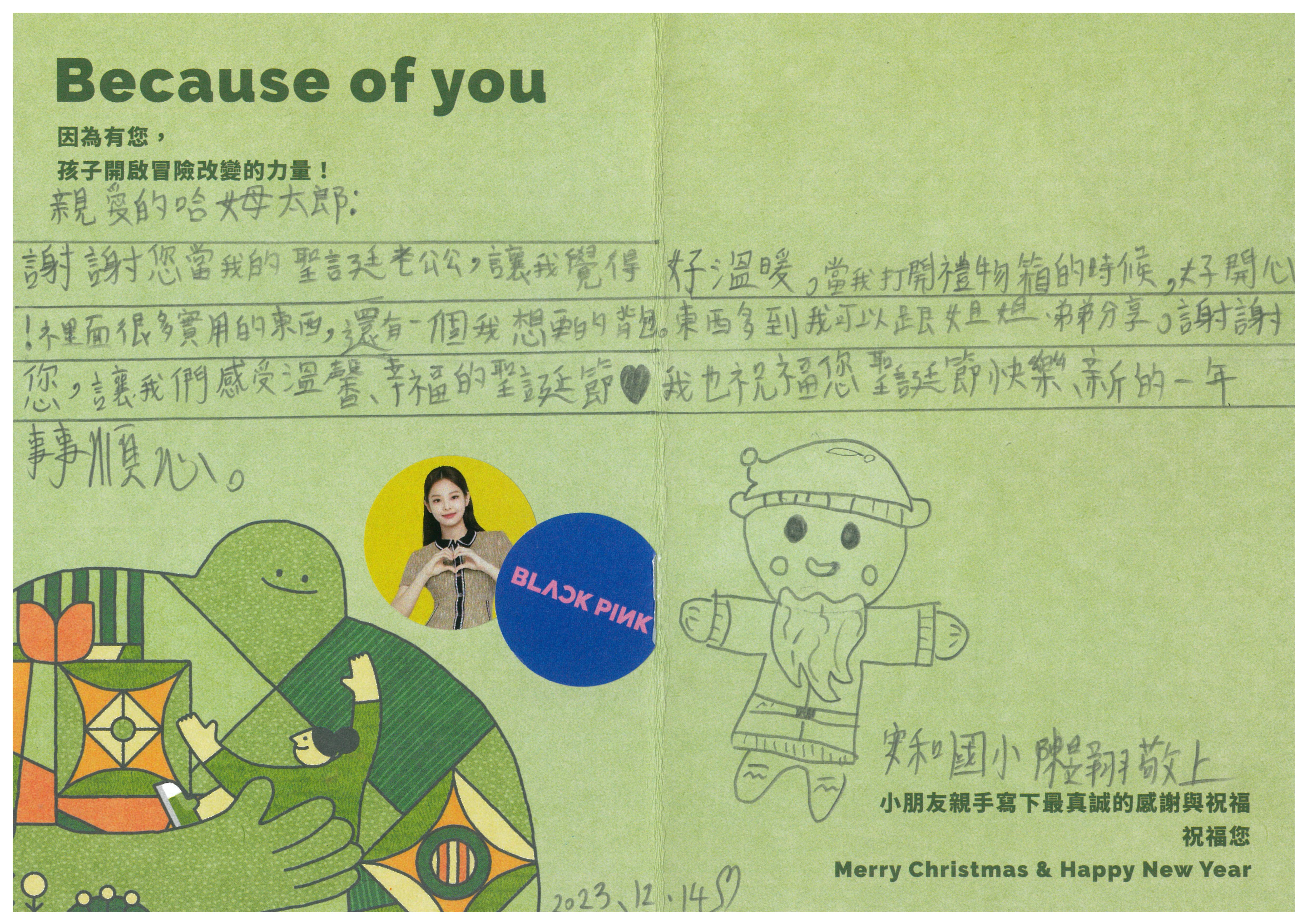 哈姆太郎 您好:方便您紀念與記錄,我們將孩子給您的感謝卡片掃描成圖檔。我們於2023/12/9(六)已將禮物發送到孩子的手上嚕!