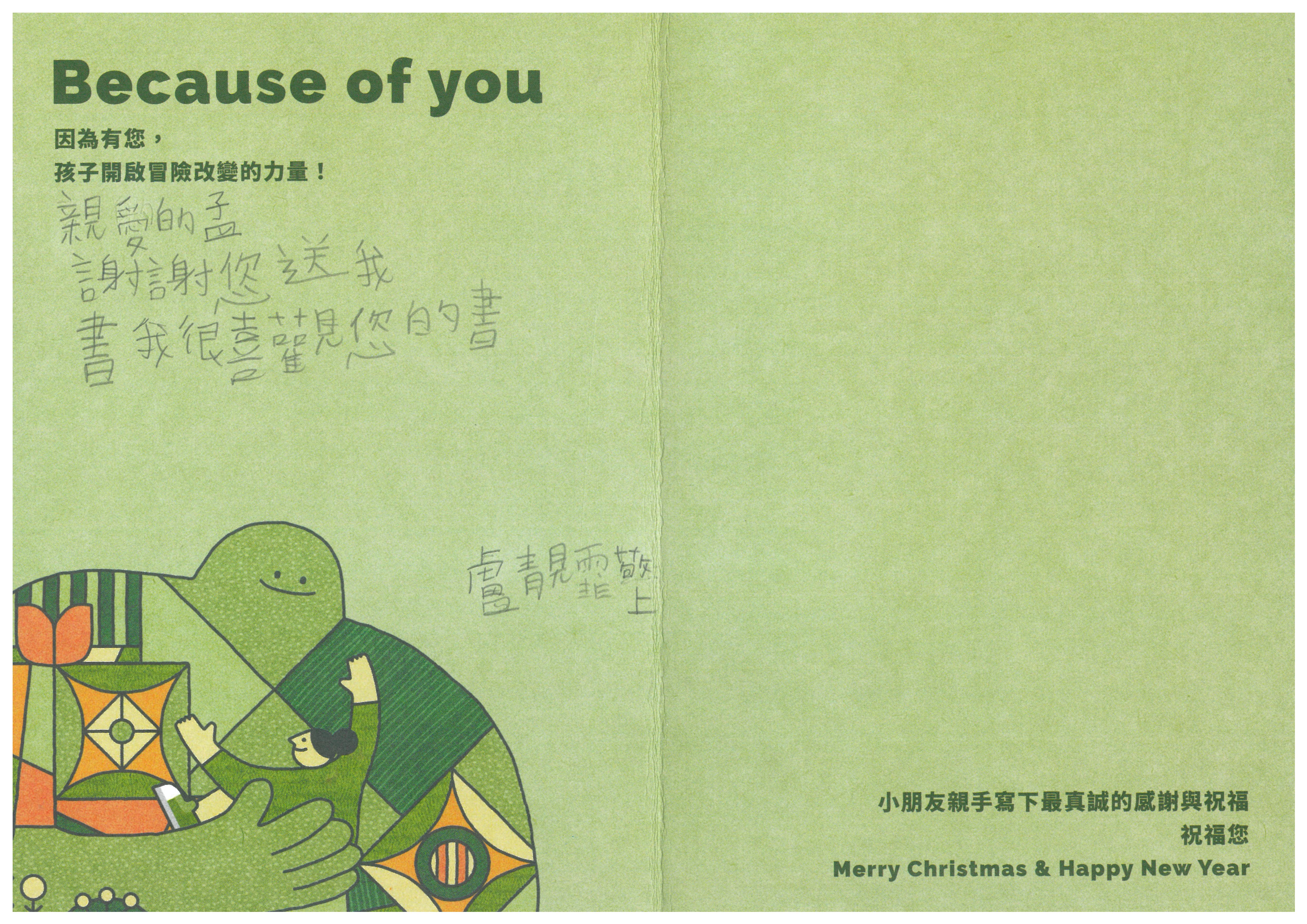mou孟 您好:方便您紀念與記錄,我們將孩子給您的感謝卡片掃描成圖檔。我們於2023/12/9(六)已將禮物發送到孩子的手上嚕!