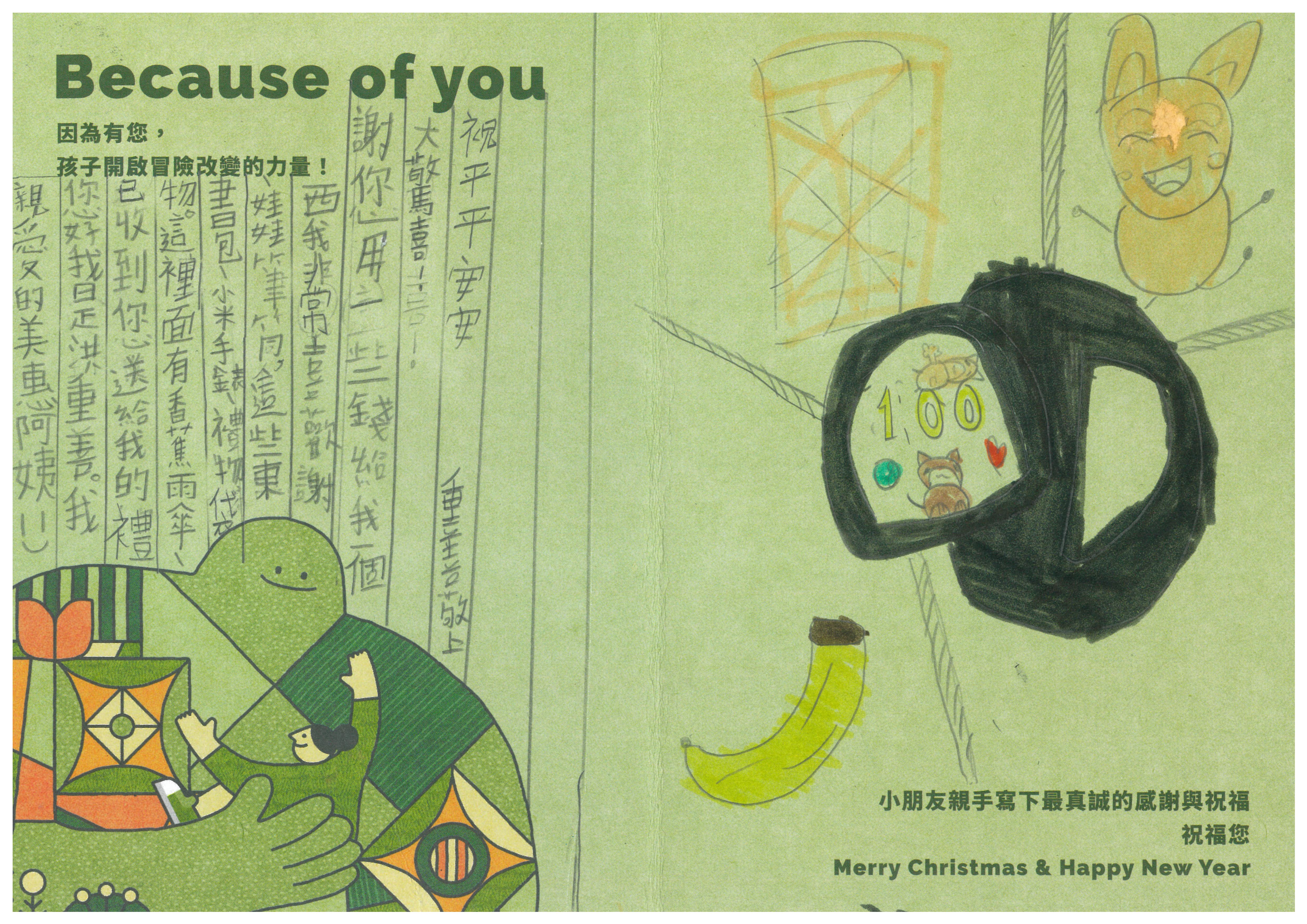 每份聖誕禮物內容:小朋友許下的心願禮物+親手寫下的鼓勵祝福卡片1張