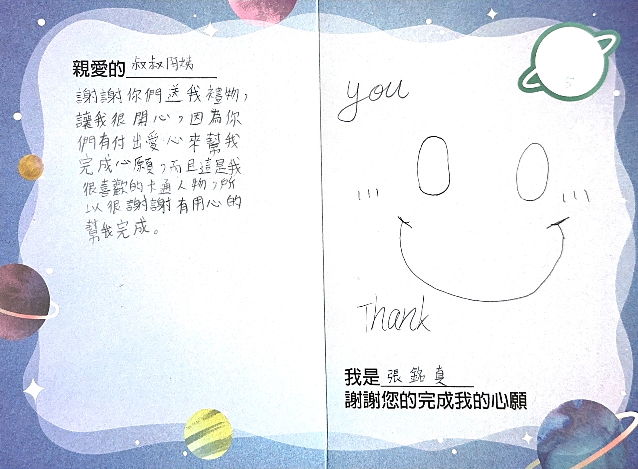 林威廷:謝謝您參與「2024大聯大愛心.圓夢計畫」活動,我們會將您的心意送達孩子手上,並於活動結束後將小朋友寫下的感謝卡片,掃描上傳至心願平台。