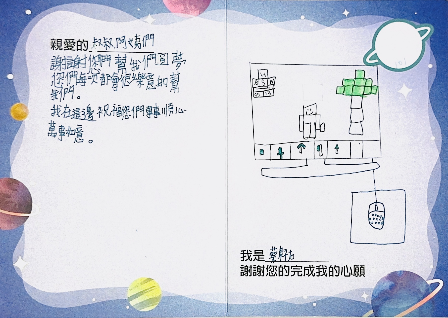 • 備註 小祐的夢想是與網際網路相關,因此,希望有一套完整的電腦設備,因此,如果有一個透氣的滑鼠,或是滑鼠墊,在使用電腦的過程中,能夠更順利,更便利。