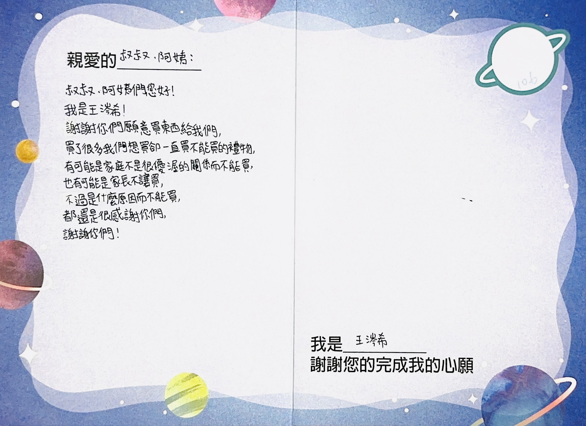 王梓函:謝謝您參與「2024大聯大愛心.圓夢計畫」活動,我們會將您的心意送達孩子手上,並於活動結束後將小朋友寫下的感謝卡片,掃描上傳至心願平台。