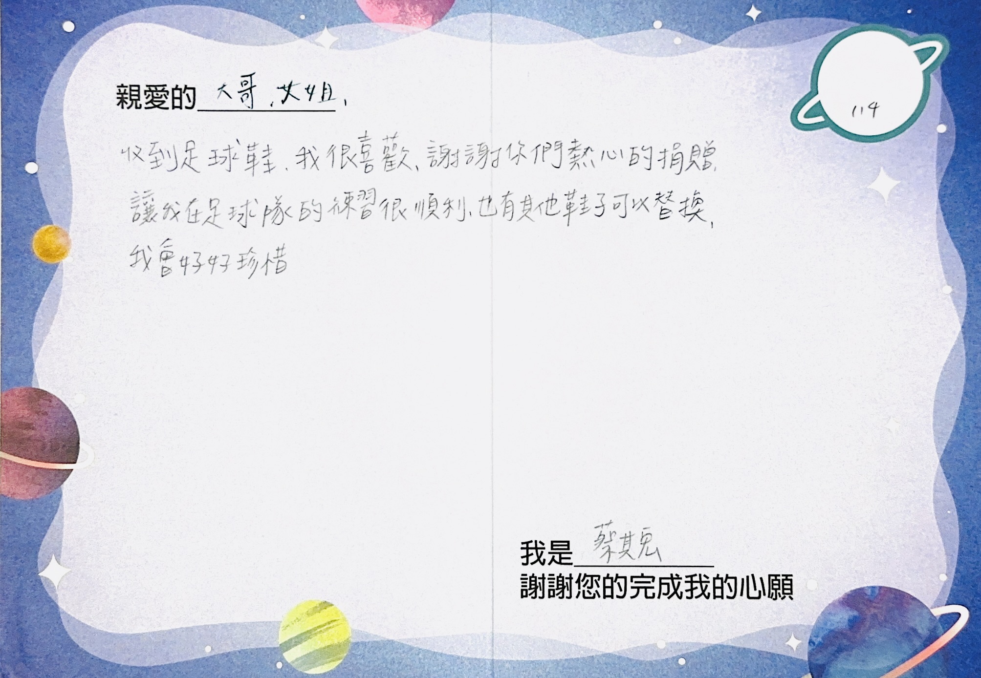 黃偉祥:您好,感謝您參與「2024大聯大愛心.圓夢計畫」活動,已將您的心意,發送到孩子的手上囉!為了將這一切永遠紀錄下來,我們將孩子給您的感謝卡片掃描成圖檔上傳至此,讓您可以回顧這一整個歷程。感謝您的愛心,未來也請您繼續支持大聯大愛心圓夢計畫。如有疑問,請teams Jun 徐嘉駿。