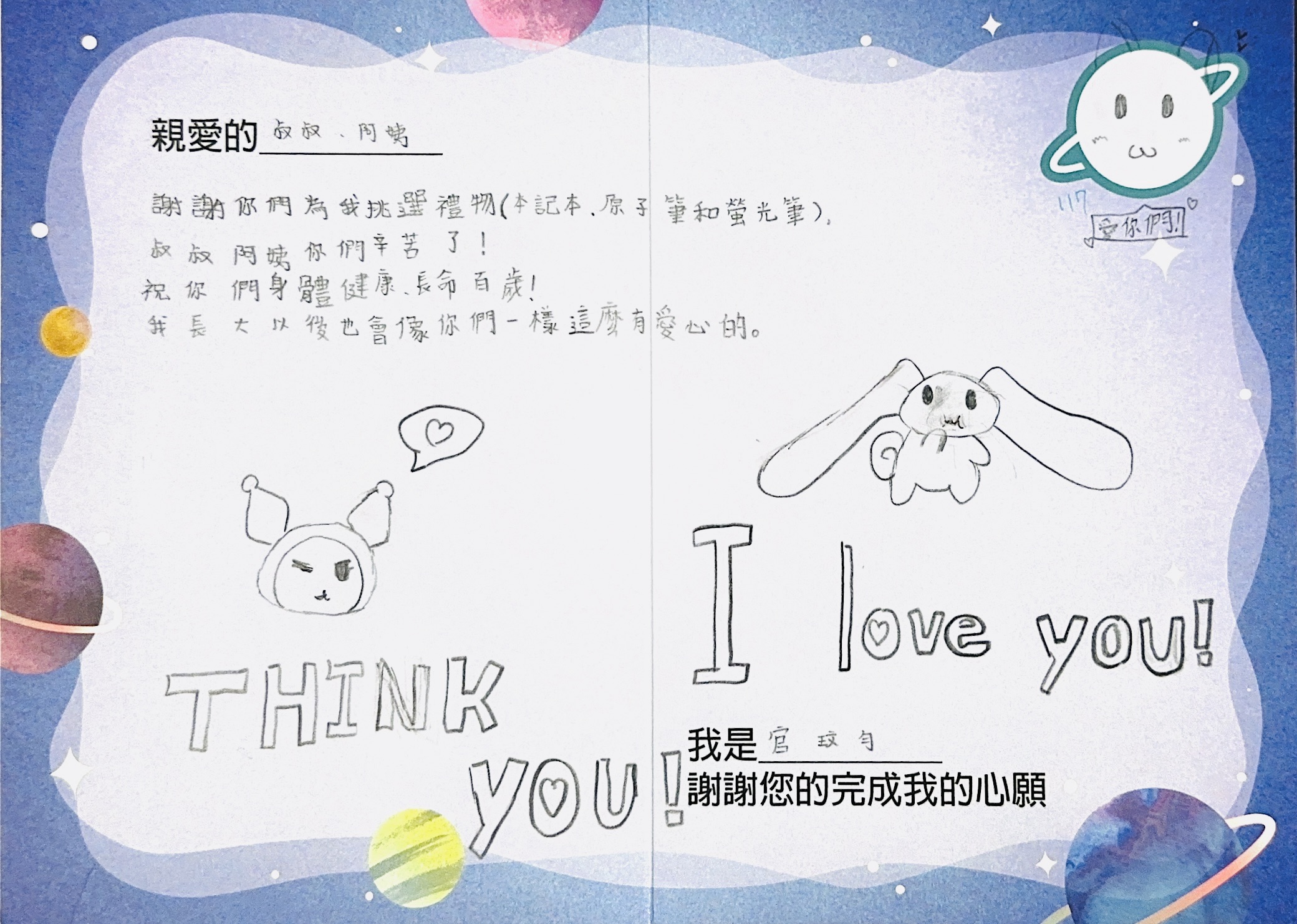 李秀洵:謝謝您參與「2024大聯大愛心.圓夢計畫」活動,我們會將您的心意送達孩子手上,並於活動結束後將小朋友寫下的感謝卡片,掃描上傳至心願平台。