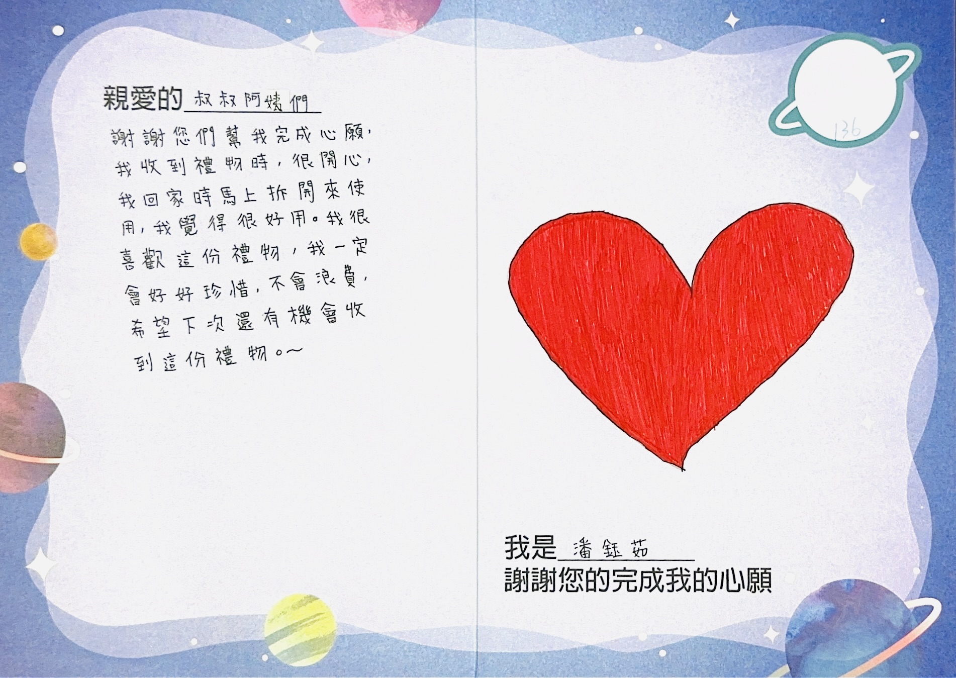 陳珮瑜:謝謝您參與「2024大聯大愛心.圓夢計畫」活動,我們會將您的心意送達孩子手上,並於活動結束後將小朋友寫下的感謝卡片,掃描上傳至心願平台。
