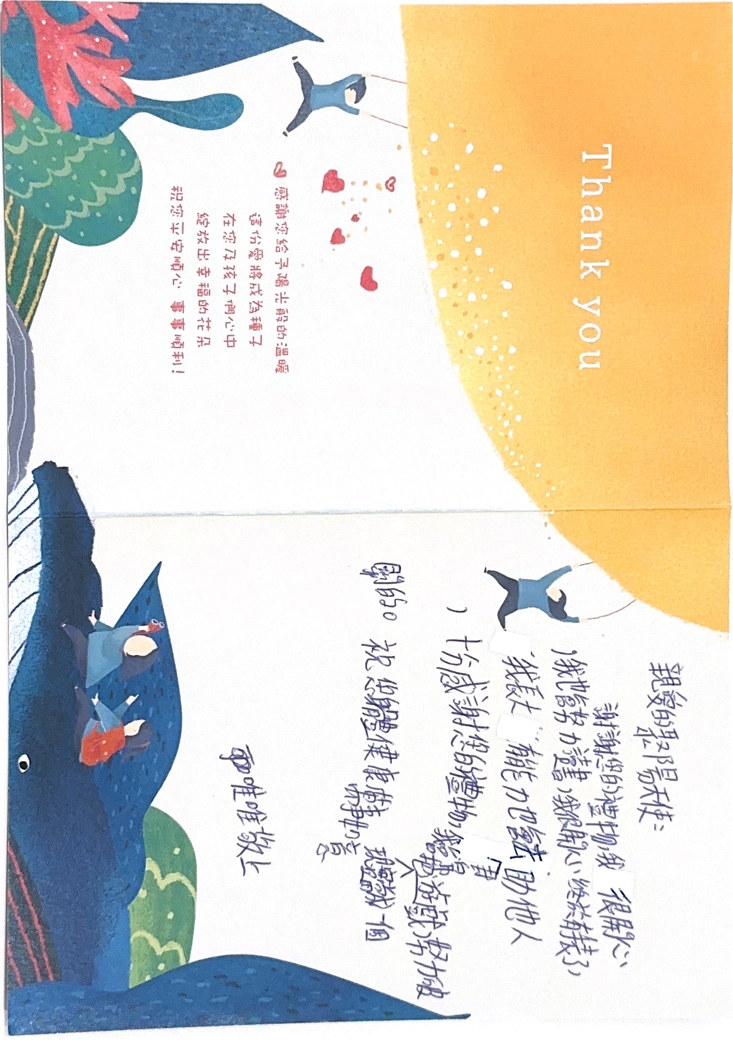 Dear 王思晴:您好,感謝您參與「2024聚陽實業x失親兒基金會」心願活動,已將您的心意,發送到孩子的手上囉!為了將這一切永遠紀錄下來,我們將孩子給您的感謝卡片掃描成圖檔上傳至此,讓您可以回顧這一整個歷程。感謝您的愛心,未來也請繼續支持聚陽實業心願活動。如有疑問,請聯繫永續發展部-Kelly#1156、Tina#1152。