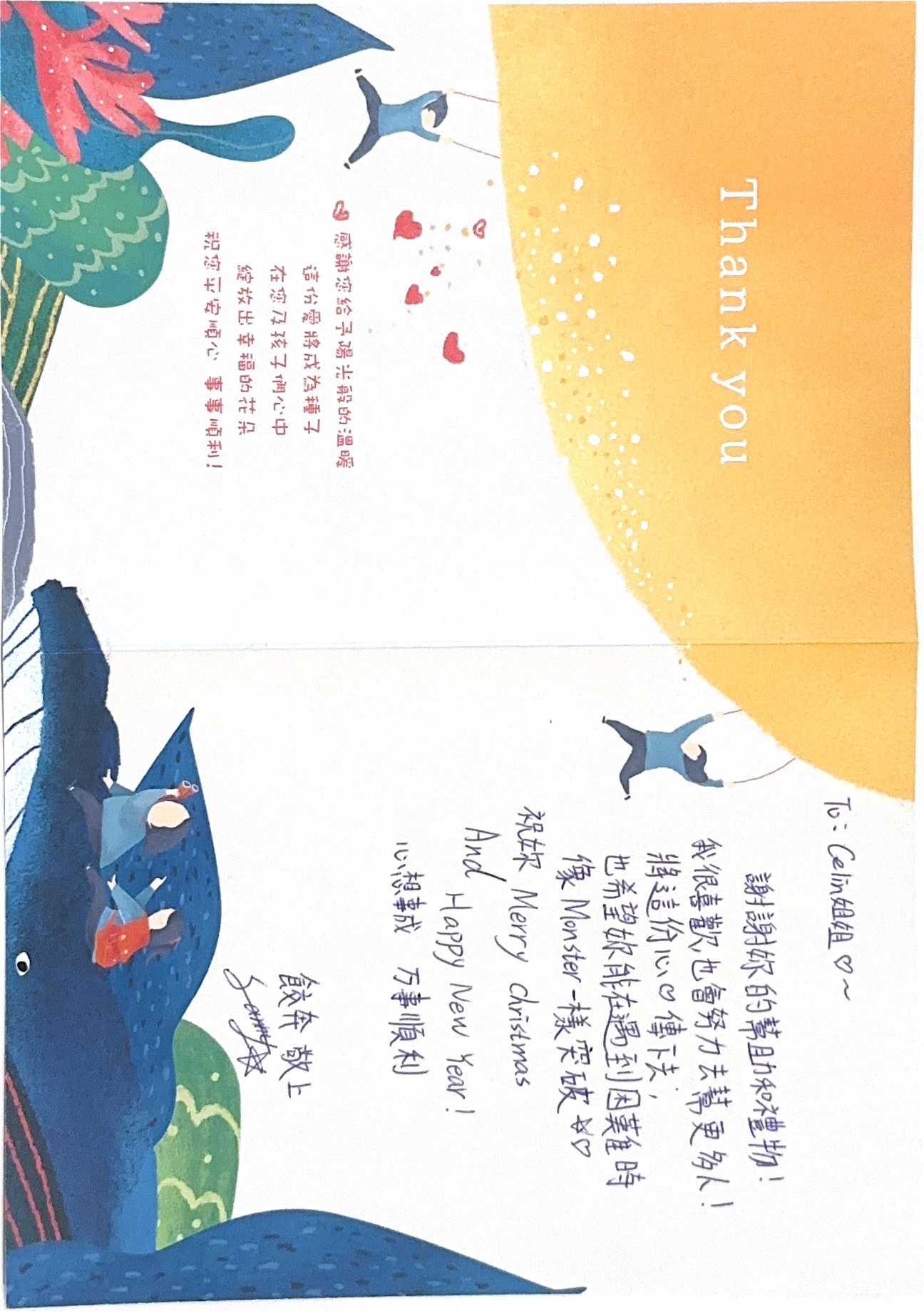 Dear 蔣韶玲:您好,感謝您參與「2024聚陽實業x失親兒基金會」心願活動,已將您的心意,發送到孩子的手上囉!為了將這一切永遠紀錄下來,我們將孩子給您的感謝卡片掃描成圖檔上傳至此,讓您可以回顧這一整個歷程。感謝您的愛心,未來也請繼續支持聚陽實業心願活動。如有疑問,請聯繫永續發展部-Kelly#1156、Tina#1152。