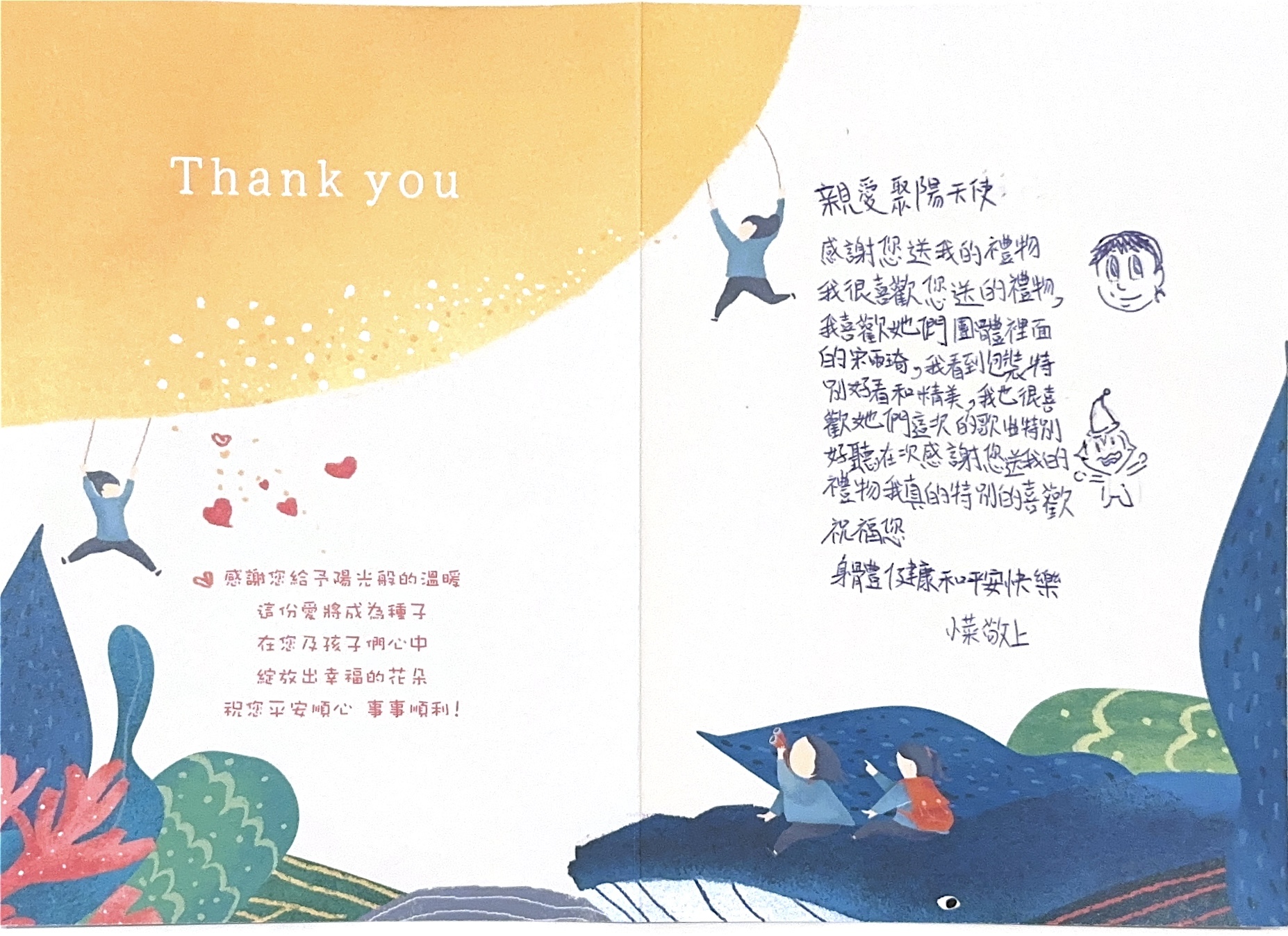 Dear max:您好,感謝您參與「2024聚陽實業x失親兒基金會」心願活動,已將您的心意,發送到孩子的手上囉!為了將這一切永遠紀錄下來,我們將孩子給您的感謝卡片掃描成圖檔上傳至此,讓您可以回顧這一整個歷程。感謝您的愛心,未來也請繼續支持聚陽實業心願活動。如有疑問,請聯繫永續發展部-Kelly#1156、Tina#1152。