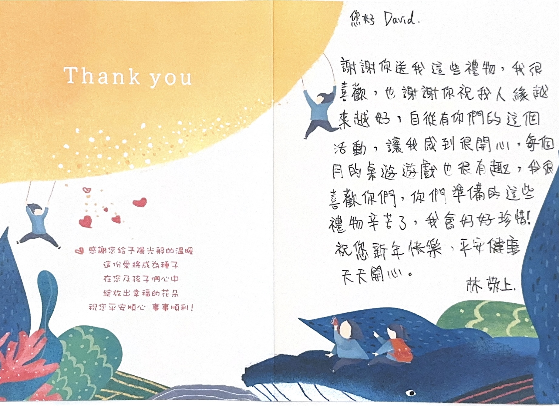 Dear 賴大偉:您好,感謝您參與「2024聚陽實業x失親兒基金會」心願活動,已將您的心意,發送到孩子的手上囉!為了將這一切永遠紀錄下來,我們將孩子給您的感謝卡片掃描成圖檔上傳至此,讓您可以回顧這一整個歷程。感謝您的愛心,未來也請繼續支持聚陽實業心願活動。如有疑問,請聯繫永續發展部-Kelly#1156、Tina#1152。