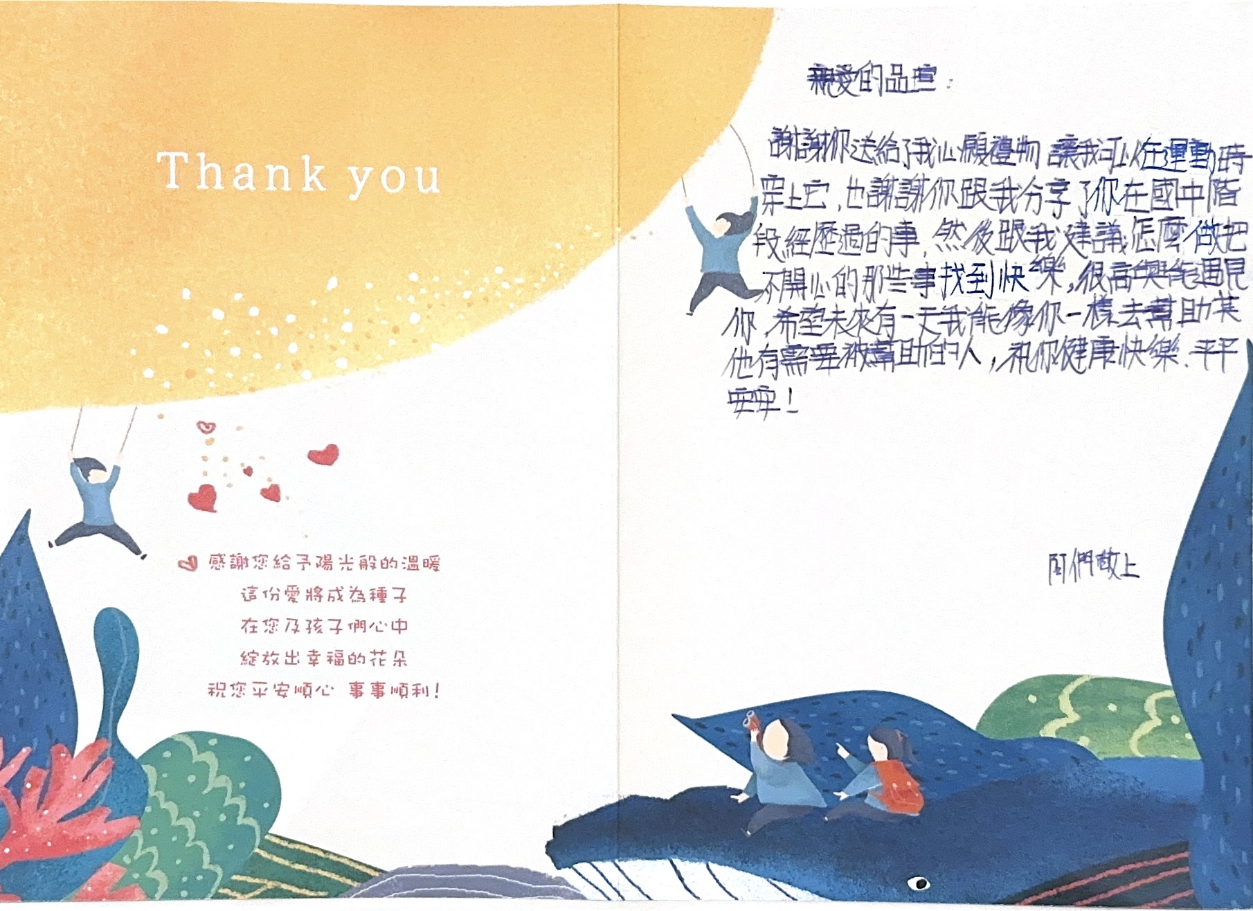 Dear 陳品瑄:您好,感謝您參與「2024聚陽實業x失親兒基金會」心願活動,已將您的心意,發送到孩子的手上囉!為了將這一切永遠紀錄下來,我們將孩子給您的感謝卡片掃描成圖檔上傳至此,讓您可以回顧這一整個歷程。感謝您的愛心,未來也請繼續支持聚陽實業心願活動。如有疑問,請聯繫永續發展部-Kelly#1156、Tina#1152。