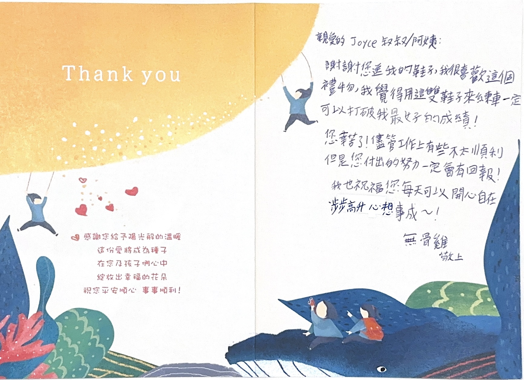 Dear 陳麗玲:您好,感謝您參與「2024聚陽實業x失親兒基金會」心願活動,已將您的心意,發送到孩子的手上囉!為了將這一切永遠紀錄下來,我們將孩子給您的感謝卡片掃描成圖檔上傳至此,讓您可以回顧這一整個歷程。感謝您的愛心,未來也請繼續支持聚陽實業心願活動。如有疑問,請聯繫永續發展部-Kelly#1156、Tina#1152。