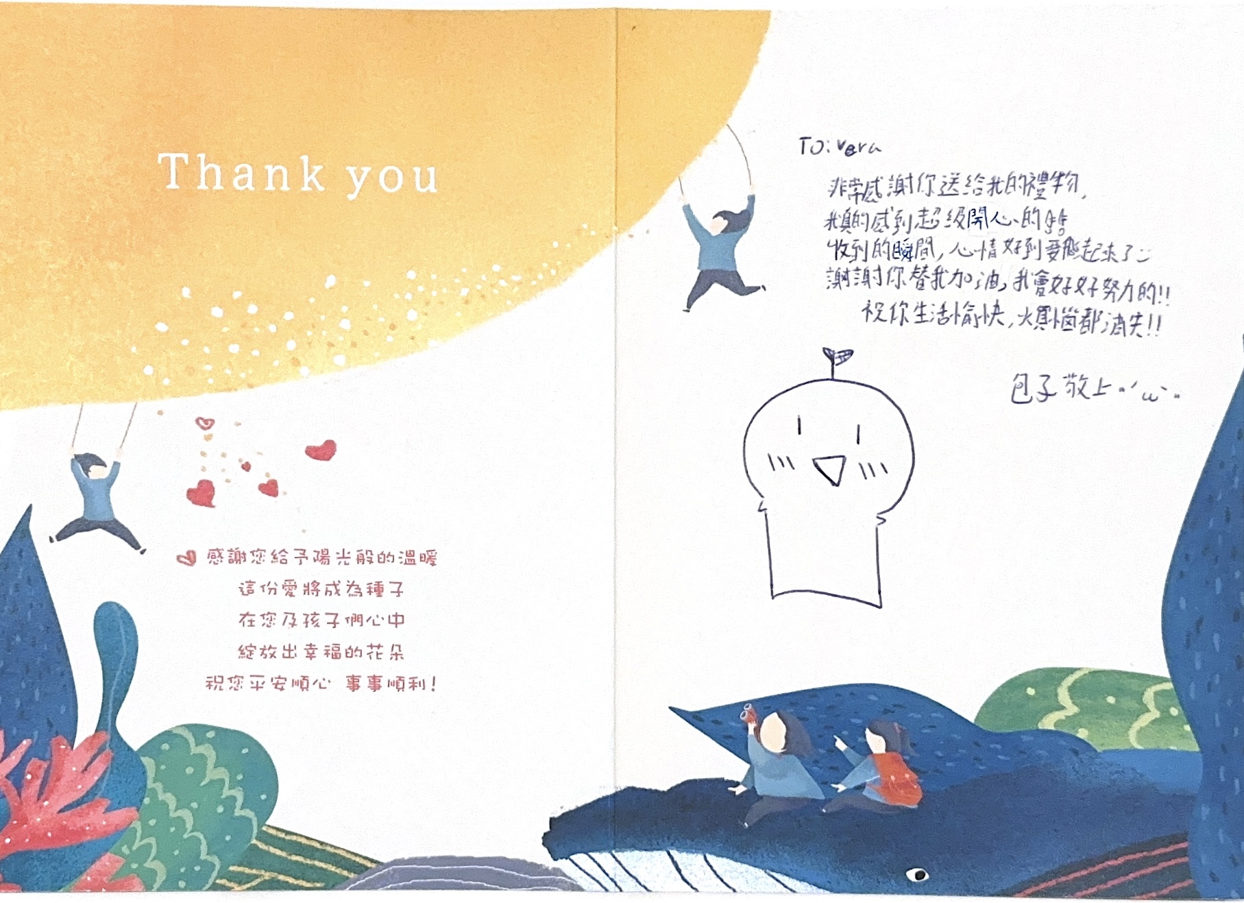 Dear 張捷茵:您好,感謝您參與「2024聚陽實業x失親兒基金會」心願活動,已將您的心意,發送到孩子的手上囉!為了將這一切永遠紀錄下來,我們將孩子給您的感謝卡片掃描成圖檔上傳至此,讓您可以回顧這一整個歷程。感謝您的愛心,未來也請繼續支持聚陽實業心願活動。如有疑問,請聯繫永續發展部-Kelly#1156、Tina#1152。