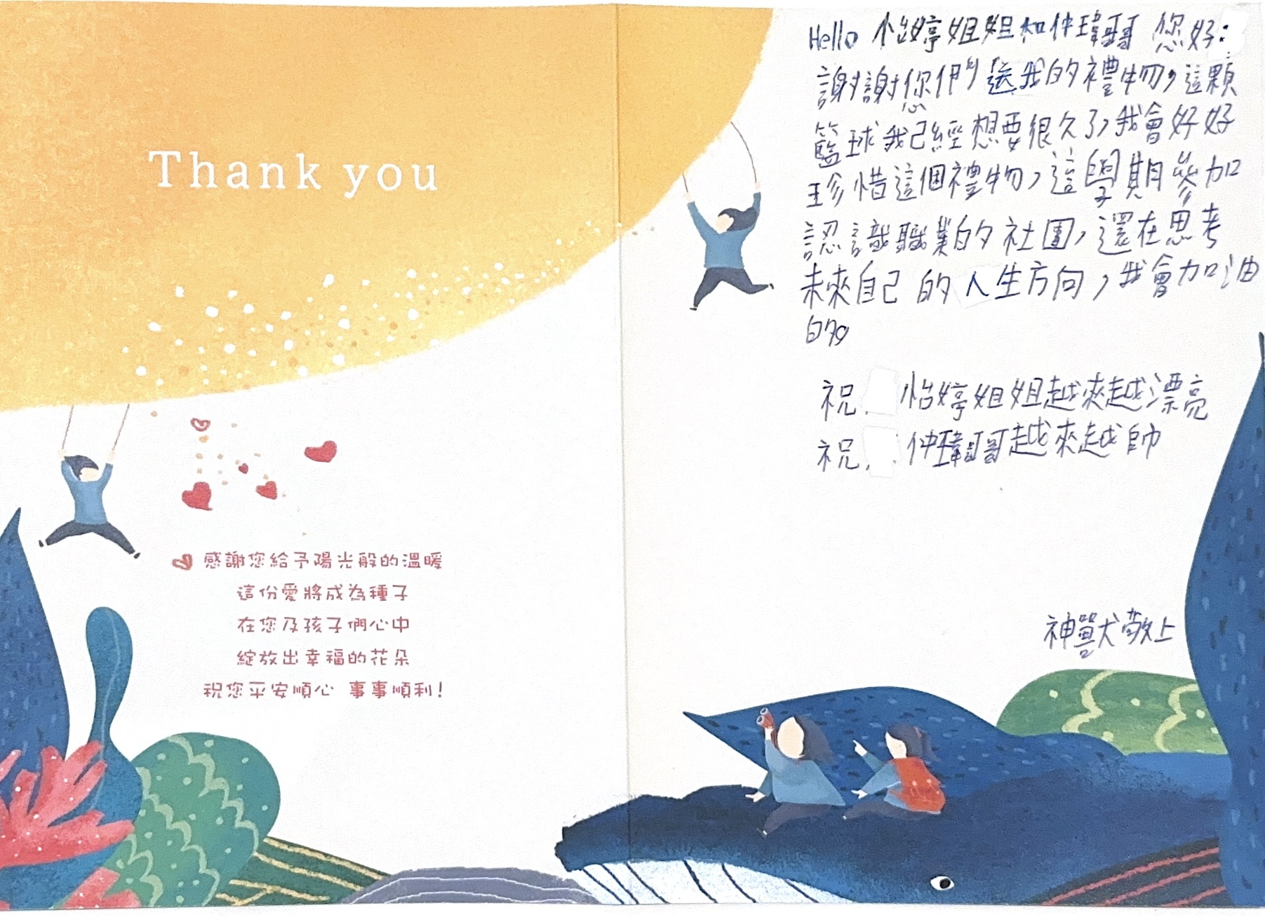 Dear 陳怡婷:您好,感謝您參與「2024聚陽實業x失親兒基金會」心願活動,已將您的心意,發送到孩子的手上囉!為了將這一切永遠紀錄下來,我們將孩子給您的感謝卡片掃描成圖檔上傳至此,讓您可以回顧這一整個歷程。感謝您的愛心,未來也請繼續支持聚陽實業心願活動。如有疑問,請聯繫永續發展部-Kelly#1156、Tina#1152。