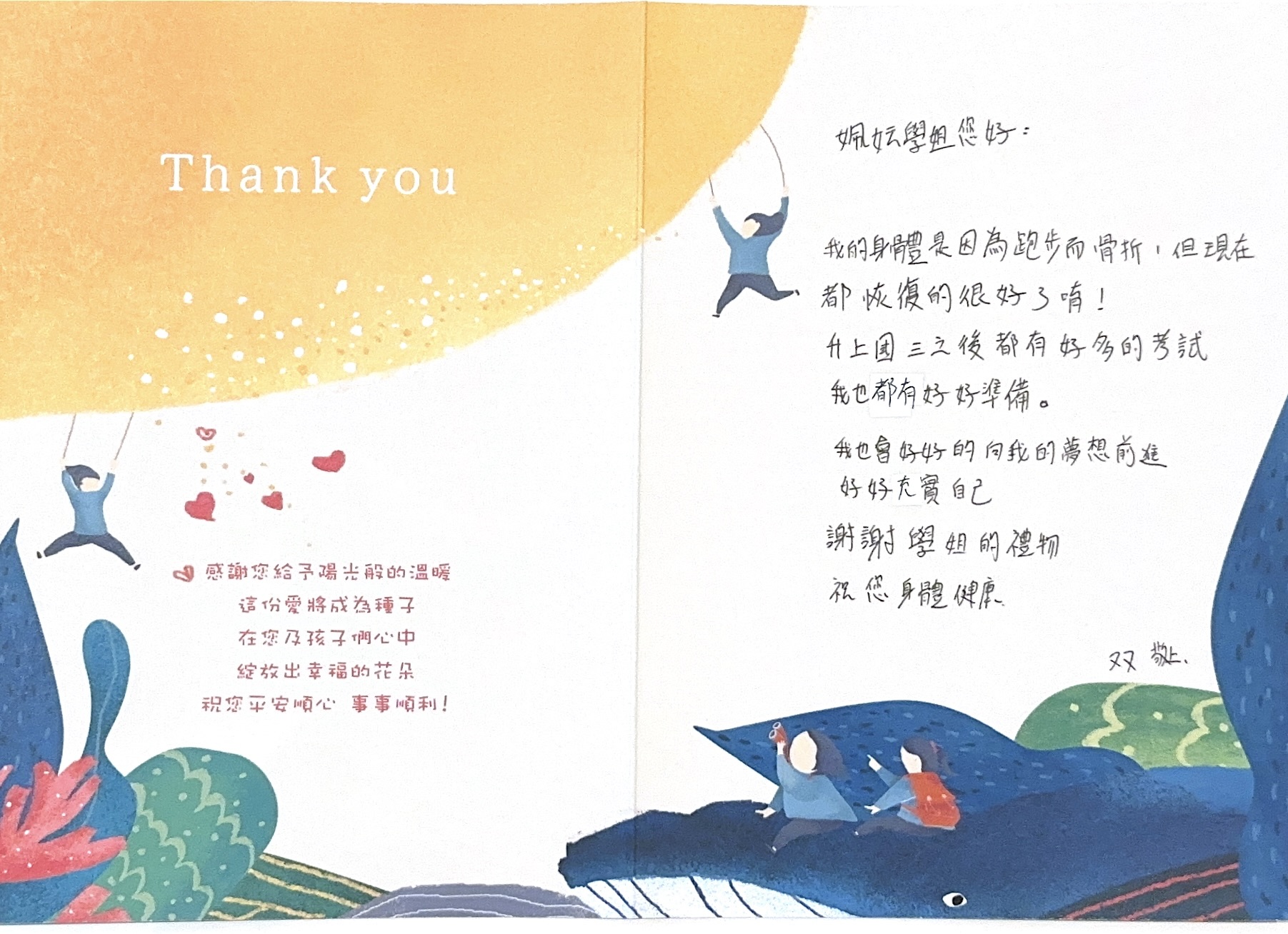 Dear 賴姵妘:您好,感謝您參與「2024聚陽實業x失親兒基金會」心願活動,已將您的心意,發送到孩子的手上囉!為了將這一切永遠紀錄下來,我們將孩子給您的感謝卡片掃描成圖檔上傳至此,讓您可以回顧這一整個歷程。感謝您的愛心,未來也請繼續支持聚陽實業心願活動。如有疑問,請聯繫永續發展部-Kelly#1156、Tina#1152。