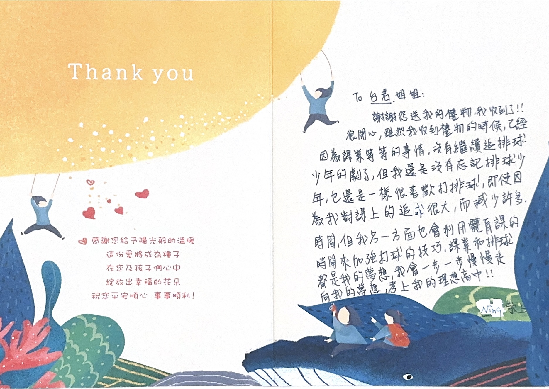 Dear 謝宜君:您好,感謝您參與「2024聚陽實業x失親兒基金會」心願活動,已將您的心意,發送到孩子的手上囉!為了將這一切永遠紀錄下來,我們將孩子給您的感謝卡片掃描成圖檔上傳至此,讓您可以回顧這一整個歷程。感謝您的愛心,未來也請繼續支持聚陽實業心願活動。如有疑問,請聯繫永續發展部-Kelly#1156、Tina#1152。