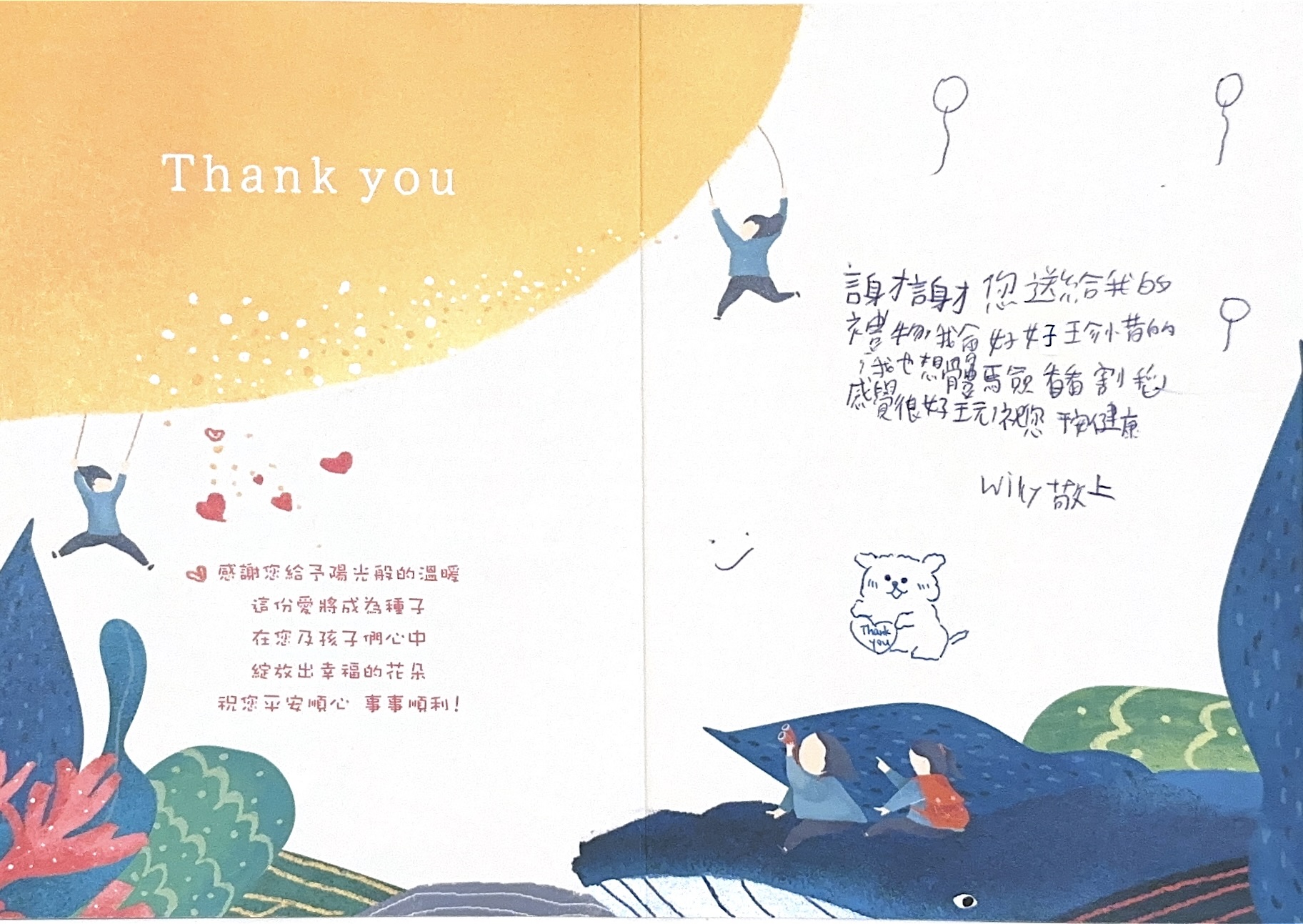 Dear 胡怡靜:您好,感謝您參與「2024聚陽實業x失親兒基金會」心願活動,已將您的心意,發送到孩子的手上囉!為了將這一切永遠紀錄下來,我們將孩子給您的感謝卡片掃描成圖檔上傳至此,讓您可以回顧這一整個歷程。感謝您的愛心,未來也請繼續支持聚陽實業心願活動。如有疑問,請聯繫永續發展部-Kelly#1156、Tina#1152。