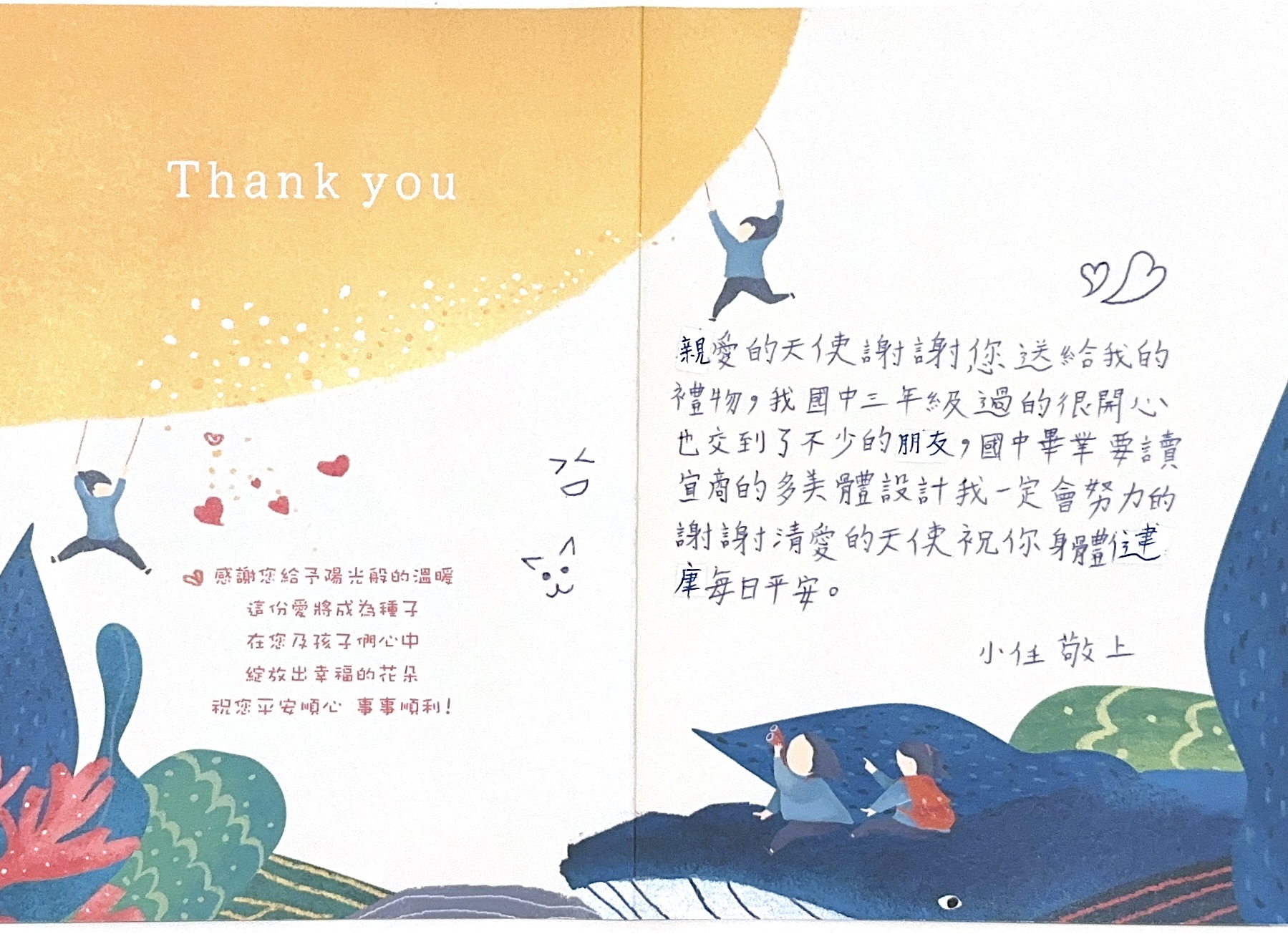 Dear 王嘉瑜:您好,感謝您參與「2024聚陽實業x失親兒基金會」心願活動,已將您的心意,發送到孩子的手上囉!為了將這一切永遠紀錄下來,我們將孩子給您的感謝卡片掃描成圖檔上傳至此,讓您可以回顧這一整個歷程。感謝您的愛心,未來也請繼續支持聚陽實業心願活動。如有疑問,請聯繫永續發展部-Kelly#1156、Tina#1152。