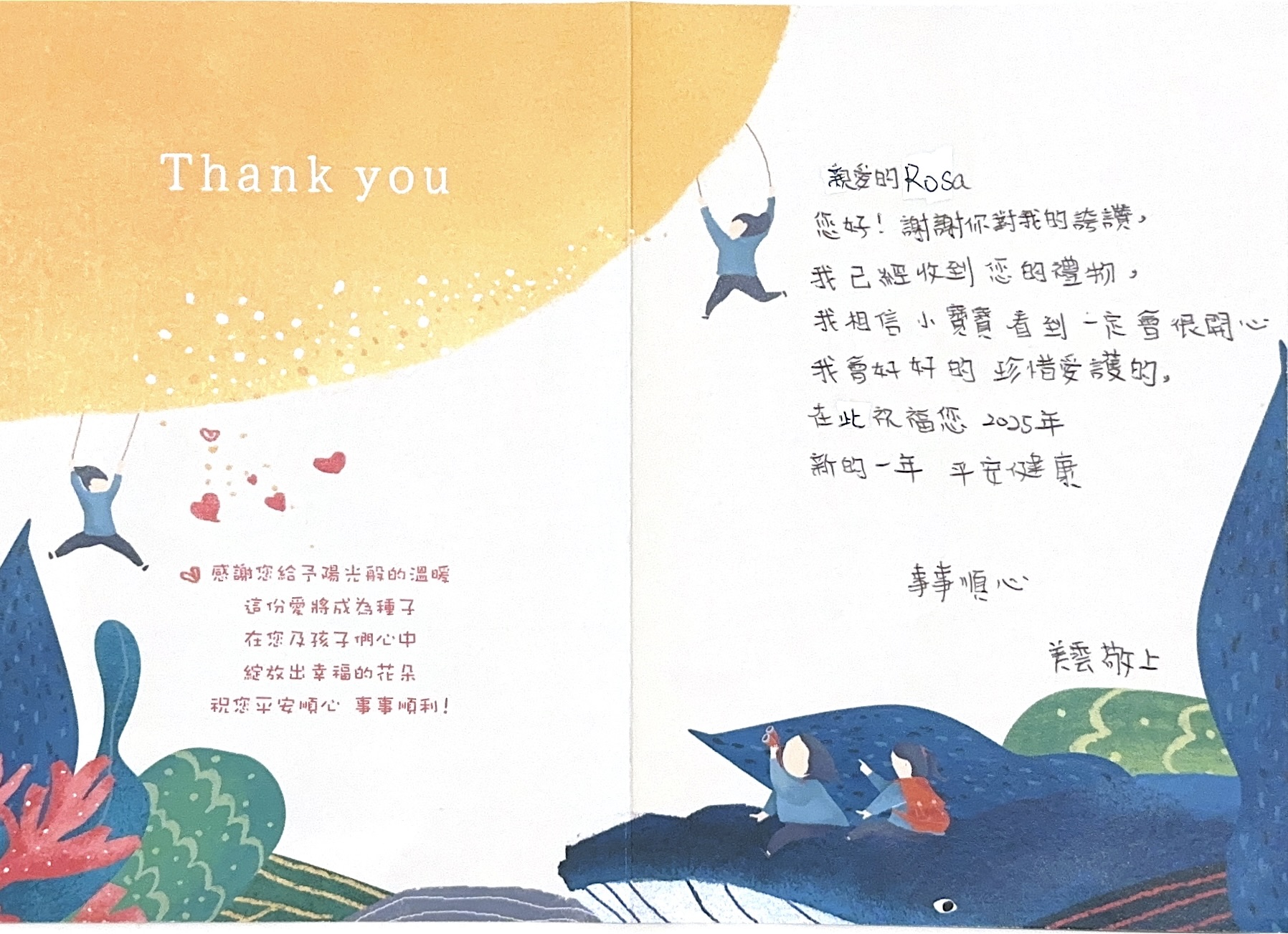 Dear 吳季芳:您好,感謝您參與「2024聚陽實業x失親兒基金會」心願活動,已將您的心意,發送到孩子的手上囉!為了將這一切永遠紀錄下來,我們將孩子給您的感謝卡片掃描成圖檔上傳至此,讓您可以回顧這一整個歷程。感謝您的愛心,未來也請繼續支持聚陽實業心願活動。如有疑問,請聯繫永續發展部-Kelly#1156、Tina#1152。