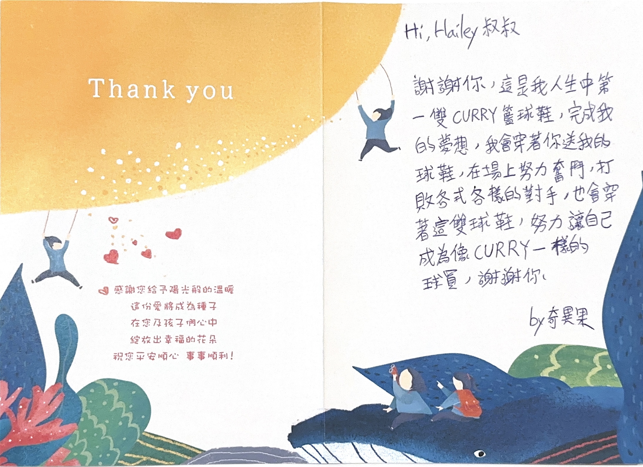 • 備註 奇異果是位活潑熱愛運動的孩子,多次參與基金會的籃球營活動,從中培力奇異果團隊互助的重要性,此次活動奇異果很開心有機會寫下自己的心願禮物,奇異果期待穿上新鞋,在球場上揮灑汗水的美好時刻。