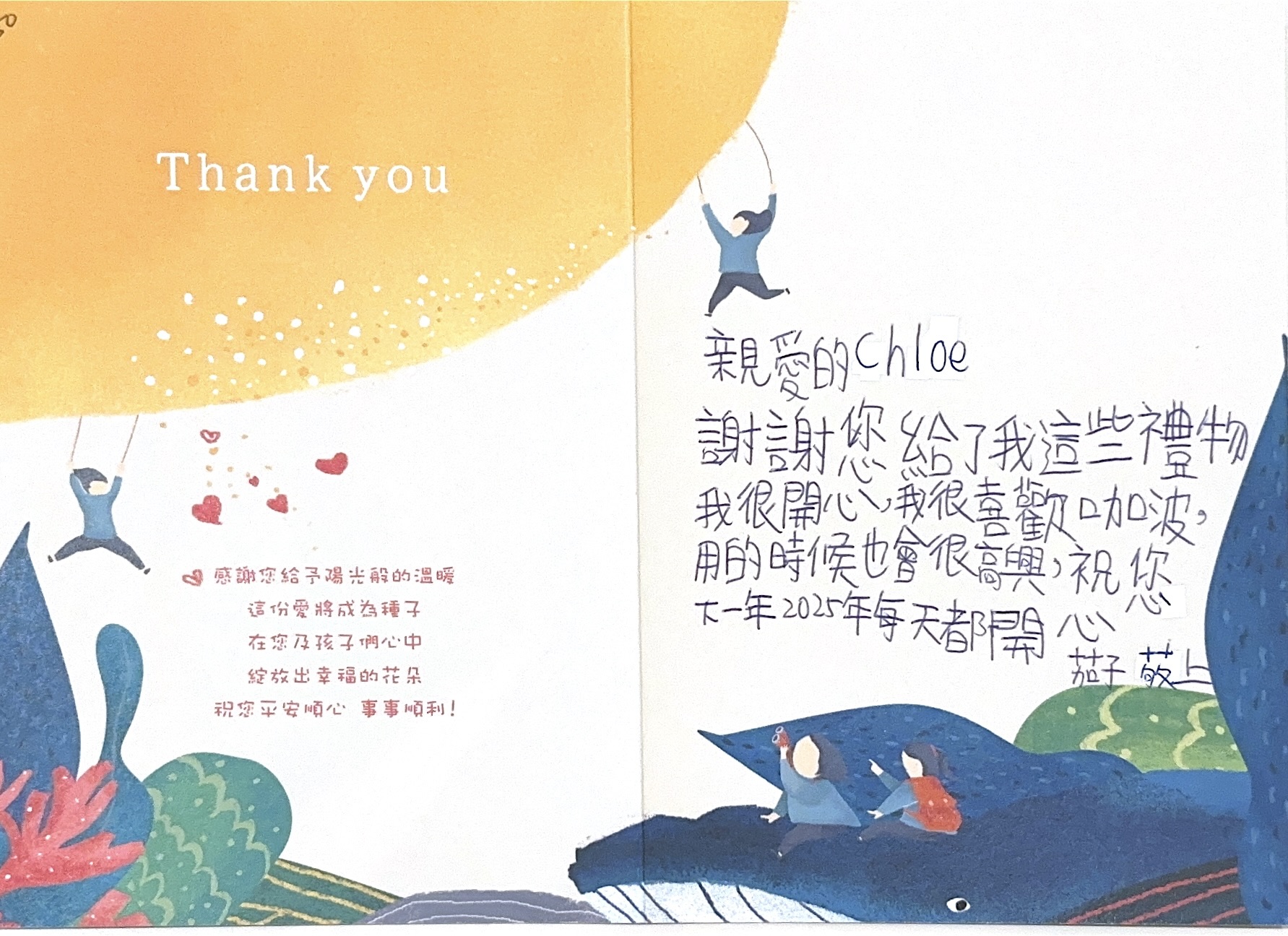 Dear 王湘洳:您好,感謝您參與「2024聚陽實業x失親兒基金會」心願活動,已將您的心意,發送到孩子的手上囉!為了將這一切永遠紀錄下來,我們將孩子給您的感謝卡片掃描成圖檔上傳至此,讓您可以回顧這一整個歷程。感謝您的愛心,未來也請繼續支持聚陽實業心願活動。如有疑問,請聯繫永續發展部-Kelly#1156、Tina#1152。