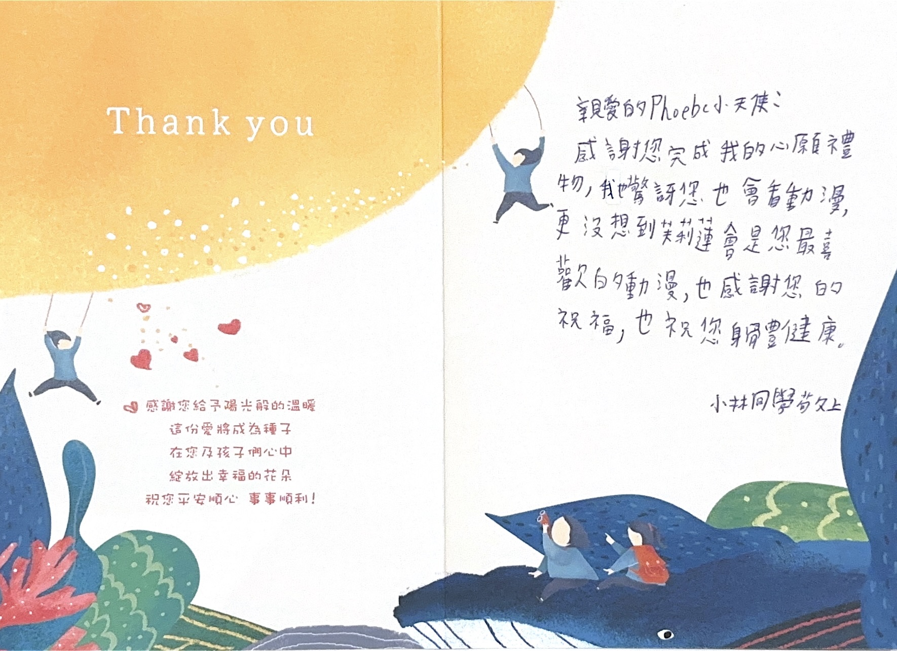 Dear 王奕婷:您好,感謝您參與「2024聚陽實業x失親兒基金會」心願活動,已將您的心意,發送到孩子的手上囉!為了將這一切永遠紀錄下來,我們將孩子給您的感謝卡片掃描成圖檔上傳至此,讓您可以回顧這一整個歷程。感謝您的愛心,未來也請繼續支持聚陽實業心願活動。如有疑問,請聯繫永續發展部-Kelly#1156、Tina#1152。