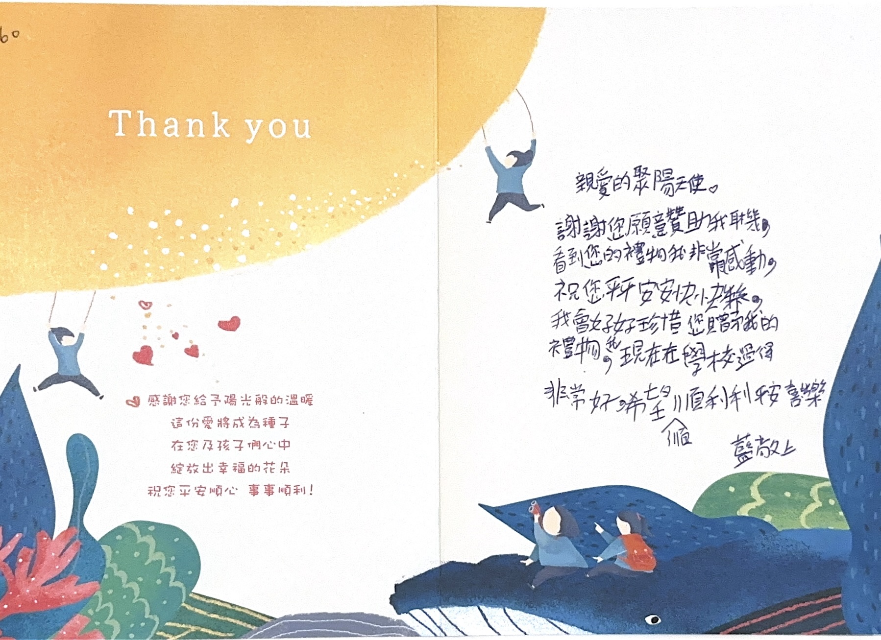 Dear 田倩宜:您好,感謝您參與「2024聚陽實業x失親兒基金會」心願活動,已將您的心意,發送到孩子的手上囉!為了將這一切永遠紀錄下來,我們將孩子給您的感謝卡片掃描成圖檔上傳至此,讓您可以回顧這一整個歷程。感謝您的愛心,未來也請繼續支持聚陽實業心願活動。如有疑問,請聯繫永續發展部-Kelly#1156、Tina#1152。