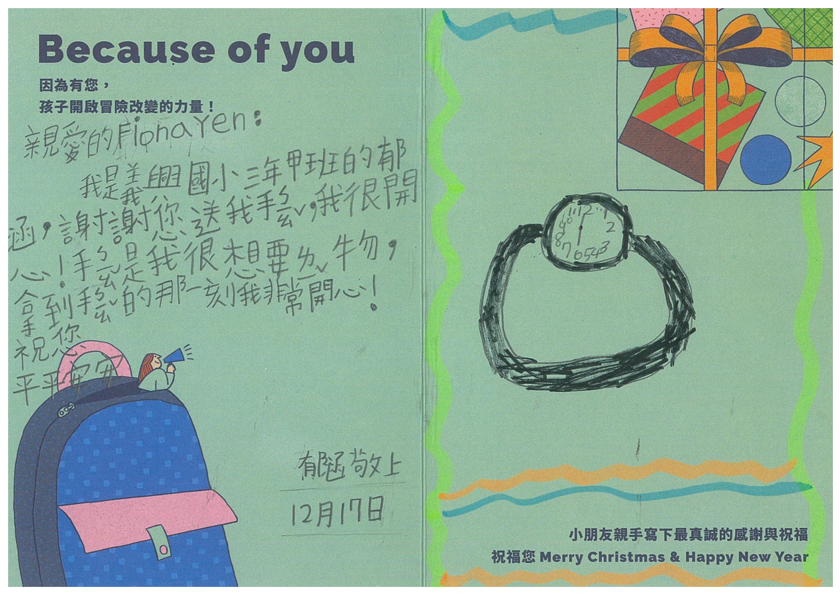 • 備註 喜歡蒐集寶可夢卡片郁涵,心願禮物是希望獲得一隻能隨時看時間的黑色手錶。郁涵身型較高大,建議認養人可購買一般成人女錶尺寸的手錶,送給郁涵。