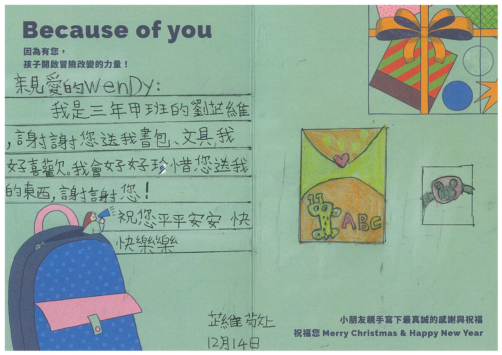 每份聖誕禮物內容:小朋友許下的心願禮物+親手寫下的鼓勵祝福卡片1張