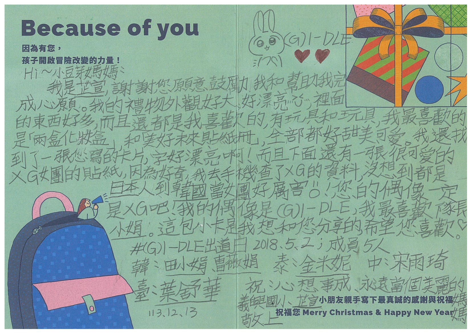 每份聖誕禮物內容:小朋友許下的心願禮物+親手寫下的鼓勵祝福卡片1張