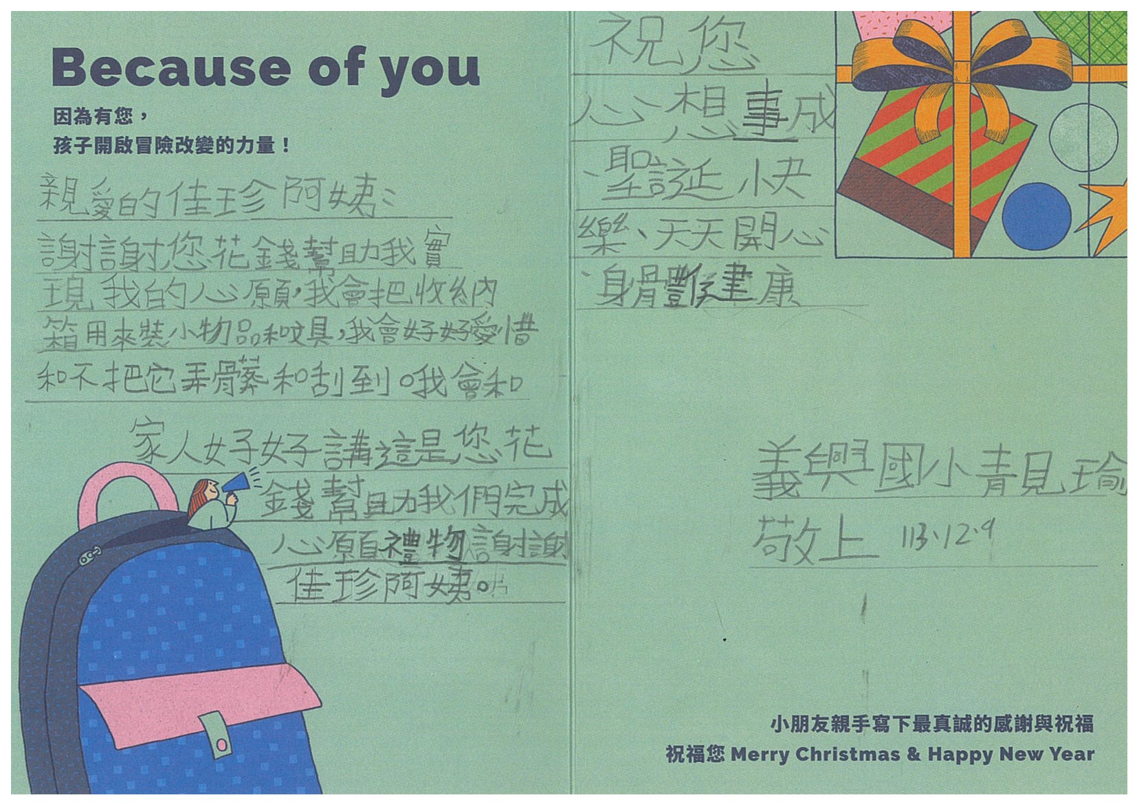每份聖誕禮物內容:小朋友許下的心願禮物+親手寫下的鼓勵祝福卡片1張