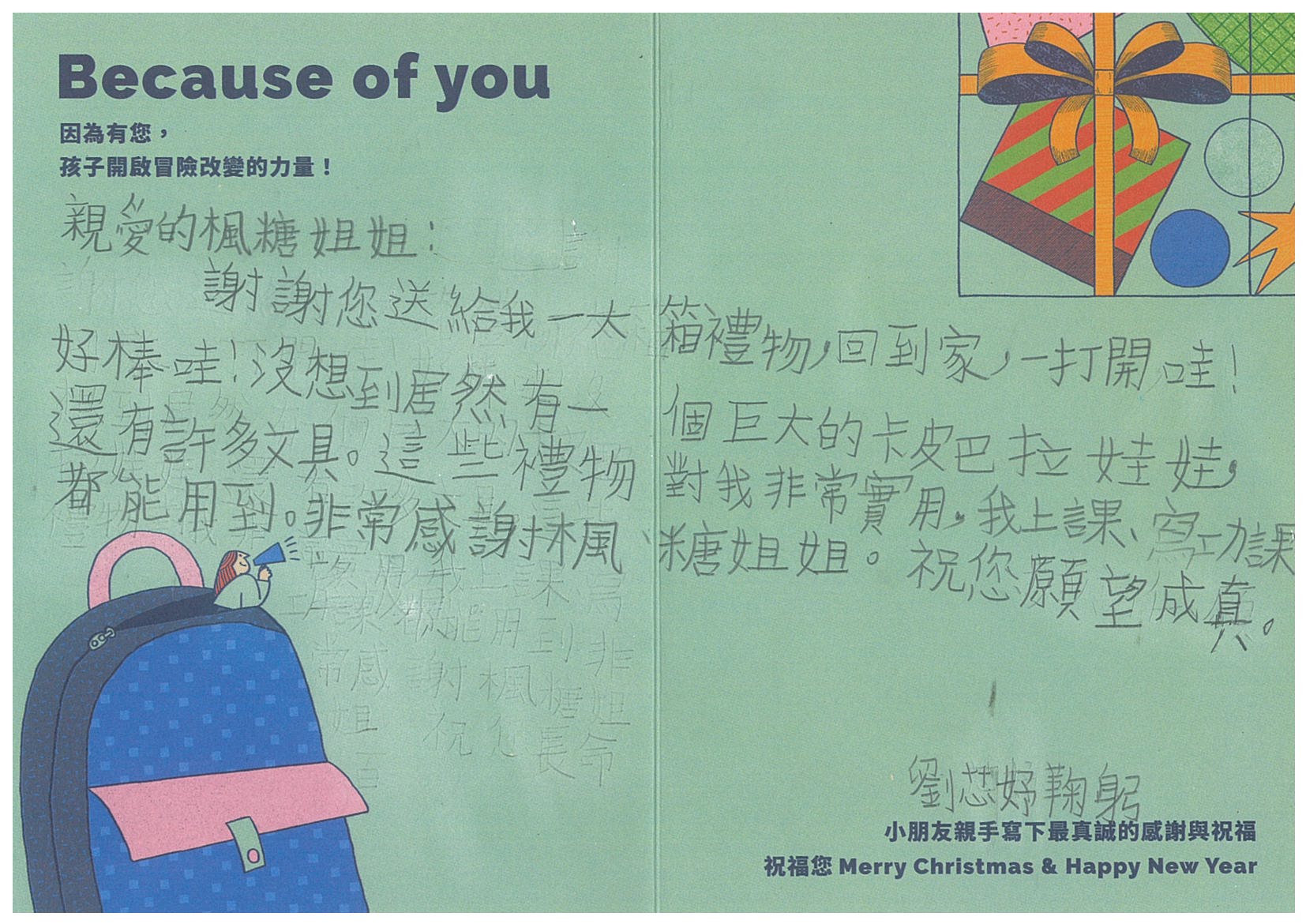每份聖誕禮物內容:小朋友許下的心願禮物+親手寫下的鼓勵祝福卡片1張