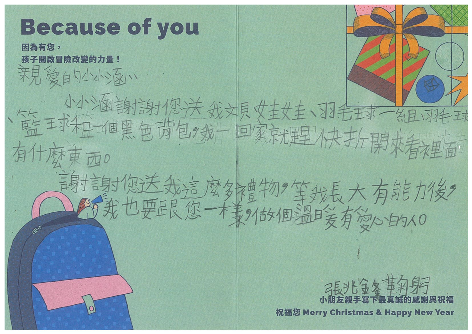 每份聖誕禮物內容:小朋友許下的心願禮物+親手寫下的鼓勵祝福卡片1張
