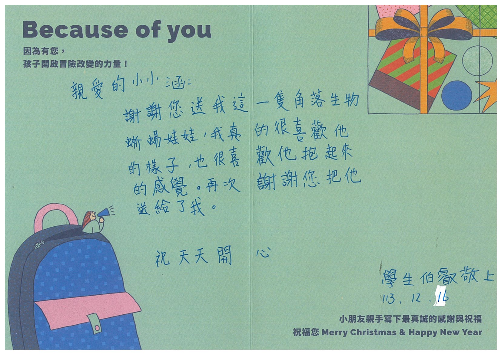 小小涵 您好:我們在12/7(六)將禮物發送到孩子的手上嚕! 在發送禮物前,我們特別為孩子設計〈品格營〉及〈反思課程〉, 最後進行〈冒險小勇者聖誕挑戰賽〉,希望能讓孩子們從心裡面長出勇氣與自信。